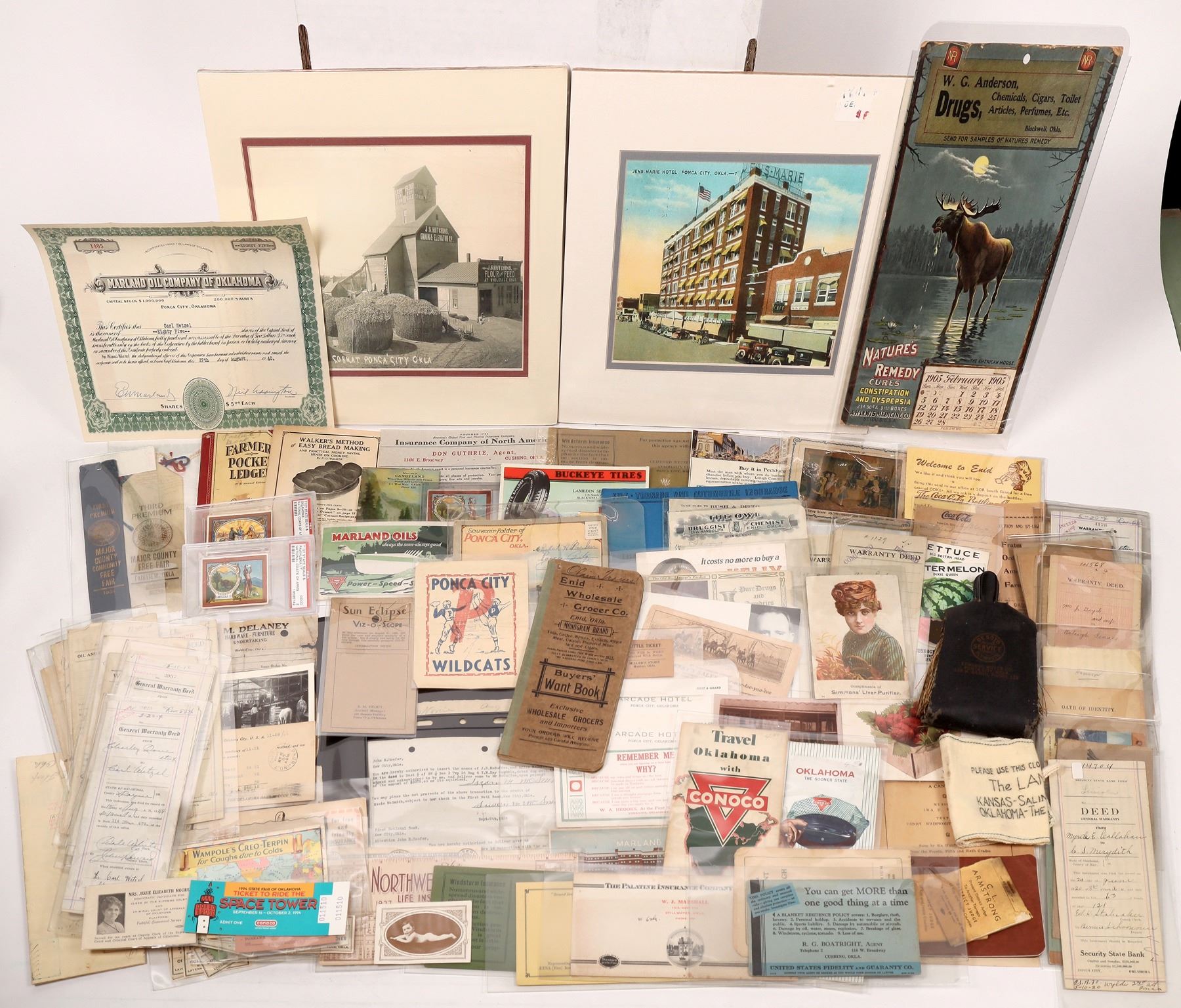 Jens-Marie Hotel, Ponca City print, 5.75x8.75". Corn at Ponca City photo 6.25x10". 1905 moose calendar, several Ponca City advertising items, Lamer Hotels, shoe cloth, assorted pocket ledgers, postcards, Oklahoma state seals cards, seed packets, business cards, insurance related ephemera, warranty deeds, travel map, Arcade Hotel letterheads and more vintage ephemera in this nice Oklahoma group.
