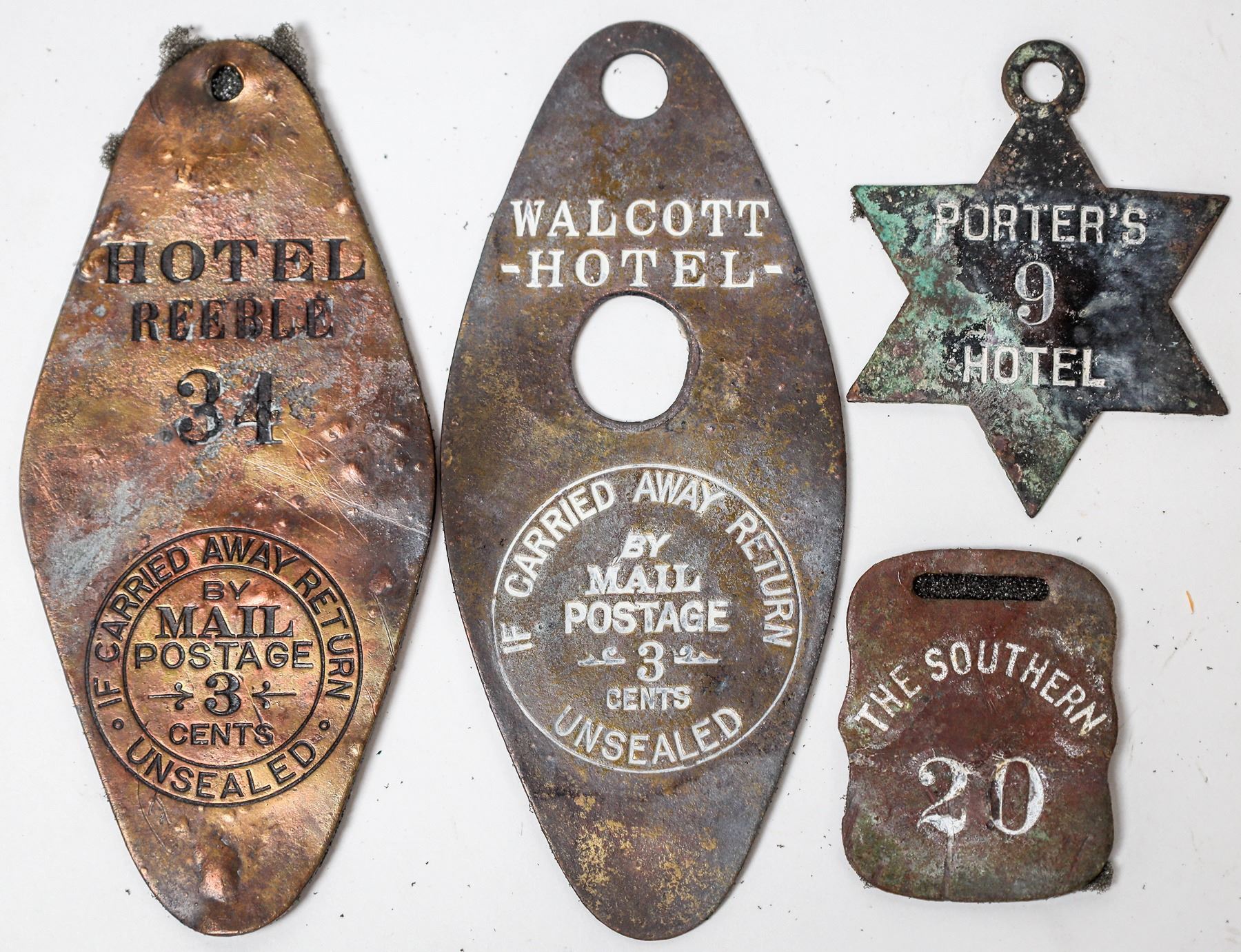 Lot of four different key tags from hotels in Oklahoma. They are from the Walcott Hotel in Shawnee, Porter's Hotel, the Southern in El Reno, and Hotel Reeble in Shawnee. Different sizes and shows. The one from the Walcott Hotel has a hole cut in the middle, probably where the room number would have been.