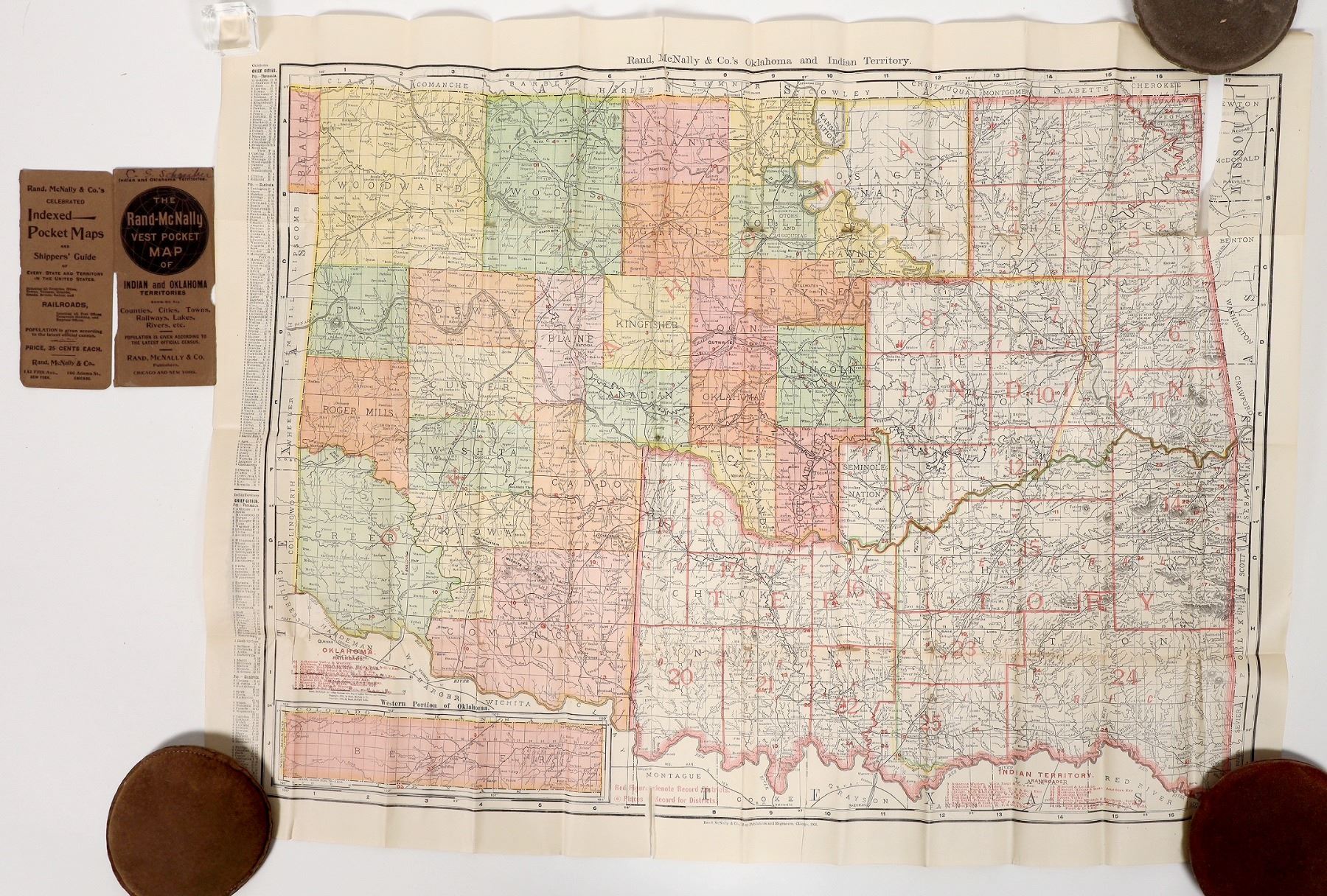 1904 Rand McNally indexed pocket color map of Oklahoma and Indian Territory. 21x27". Cover is detached, map creases have small tears. Please inspect.
