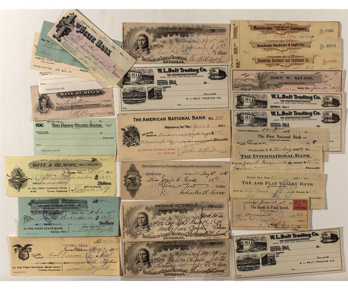 Lot of 26. Includes: three pictorial Ferdinand Ritterbusch checks, Guthrie (1899); Muskogee, I.T. (1905); Olney, I.T. (1908); Coalgate, I.T. (1907); Wetkuma, Ind. Ter. (1906); Pond Creek, O.T. (1899); pictorial Minco, I.T. (1893); pictorial Beaver, Okla. (1913); three El Reno, Ok. Terr. (1902-1906); four pictorial W.L. Belt Trading Co., Eufaula, Canadain, Mellette (191-); Lawton (1920); Jenks, Ind. Terr. (1908); four Optima (1915, two for 1917, 1919); and three modern unused. (Prag Collection)
