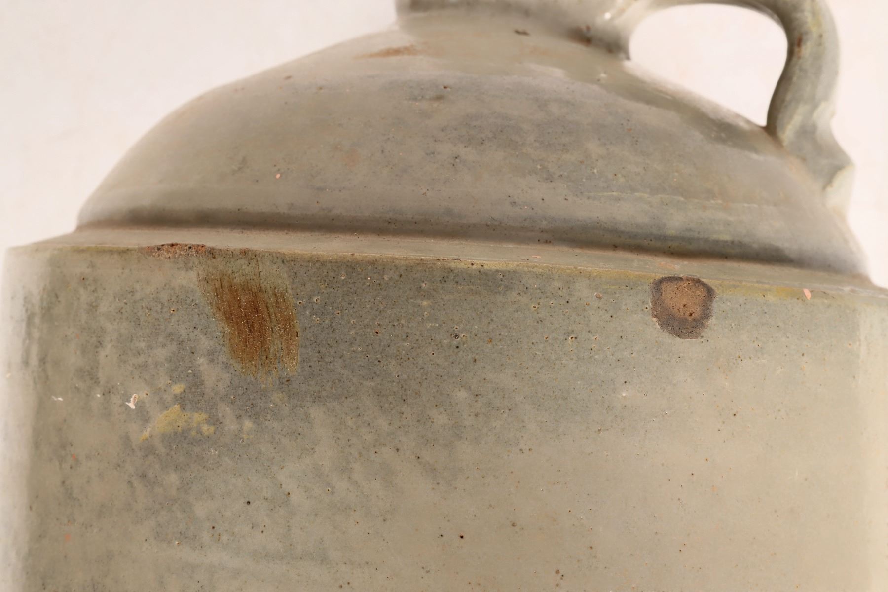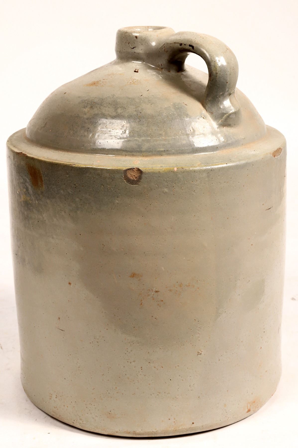 Unknown Oklahoma jug. Outline of Oklahoma state with A?? Pottery/Co. 12x9". 2 shoulder chips .5" and 1", 6" side crack, thin crack from lip down to base. Please inspect.