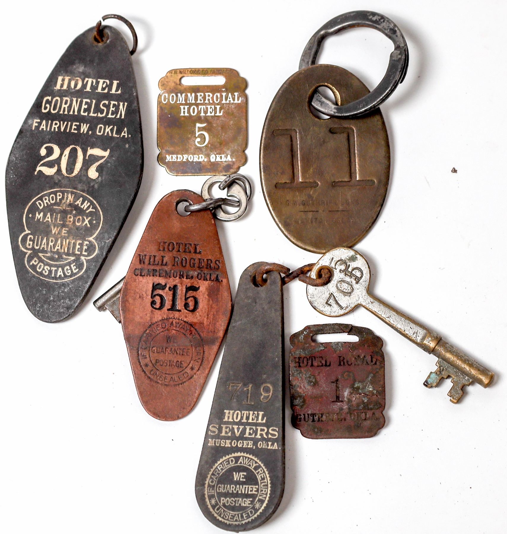 Group of six different hotel key tags from Oklahoma. They are from the Hotel Severs in Muskogee, Hotel Will Rogers in Claremore, Hotel Gornelsen in Fairview, Commercial Hotel in Medford, G.W. Guthrie & Sons in Wakita, and Hotel Royal in Guthrie. Two still have the keys attached. Various sizes and shapes, some slightly rusted.