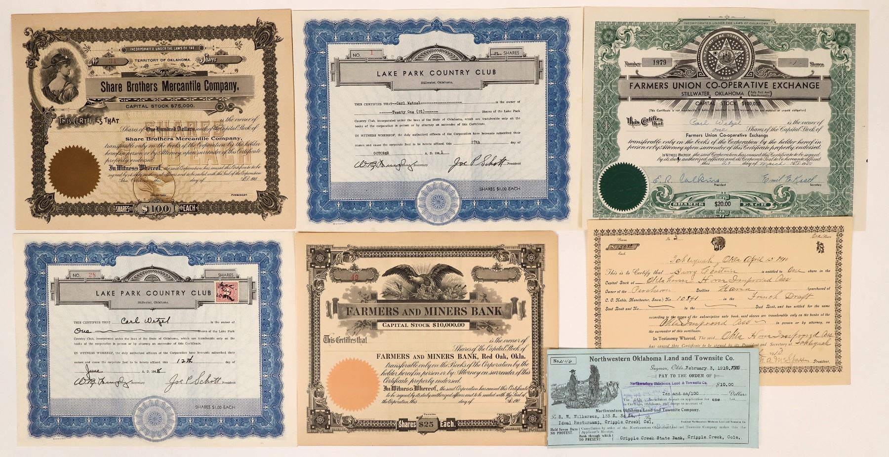 Lot of 7. Includes: Farmers Union Co-Operative Exchange (Stillwater, OK) (1950): Share Brothers Mercantile Company (unissued, 190-); Farmers and Miners Bank (unissued, 190-); Lake Park Country Club (Stillwater, two issued stocks, 1914 and 1948, incl. #1); Oklahoma Horse(House?) Improved Association (1910); and Northwestern Oklahoma Land & Townsite Company pictorial draft, 1910. Please inspect.