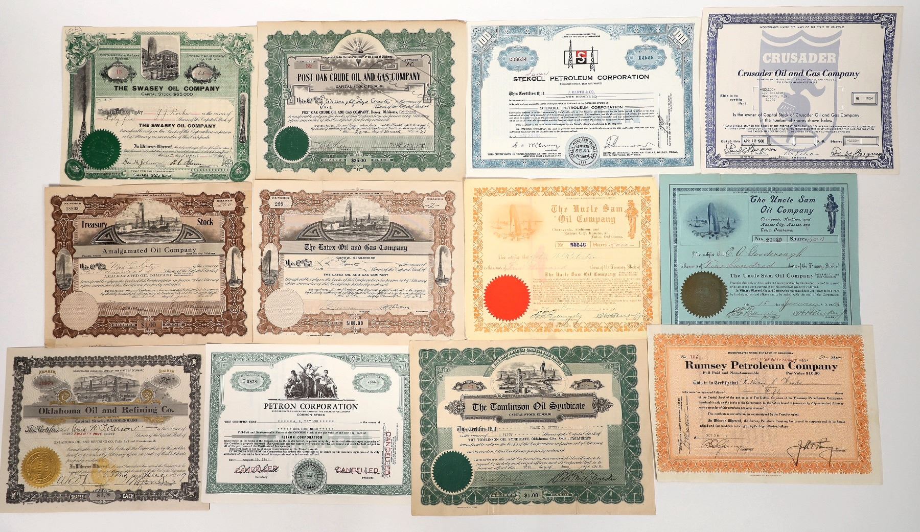 14 Oklahoma oil stocks, 1918-68 mostly older. Sunac Petro., Crusader Oil and Gas, Amalgamated Oil, Uncle Sam, CC Julian Oil & Royalties with fraudster Julian signature, Post Oak Cude and Gas etc. See photo.