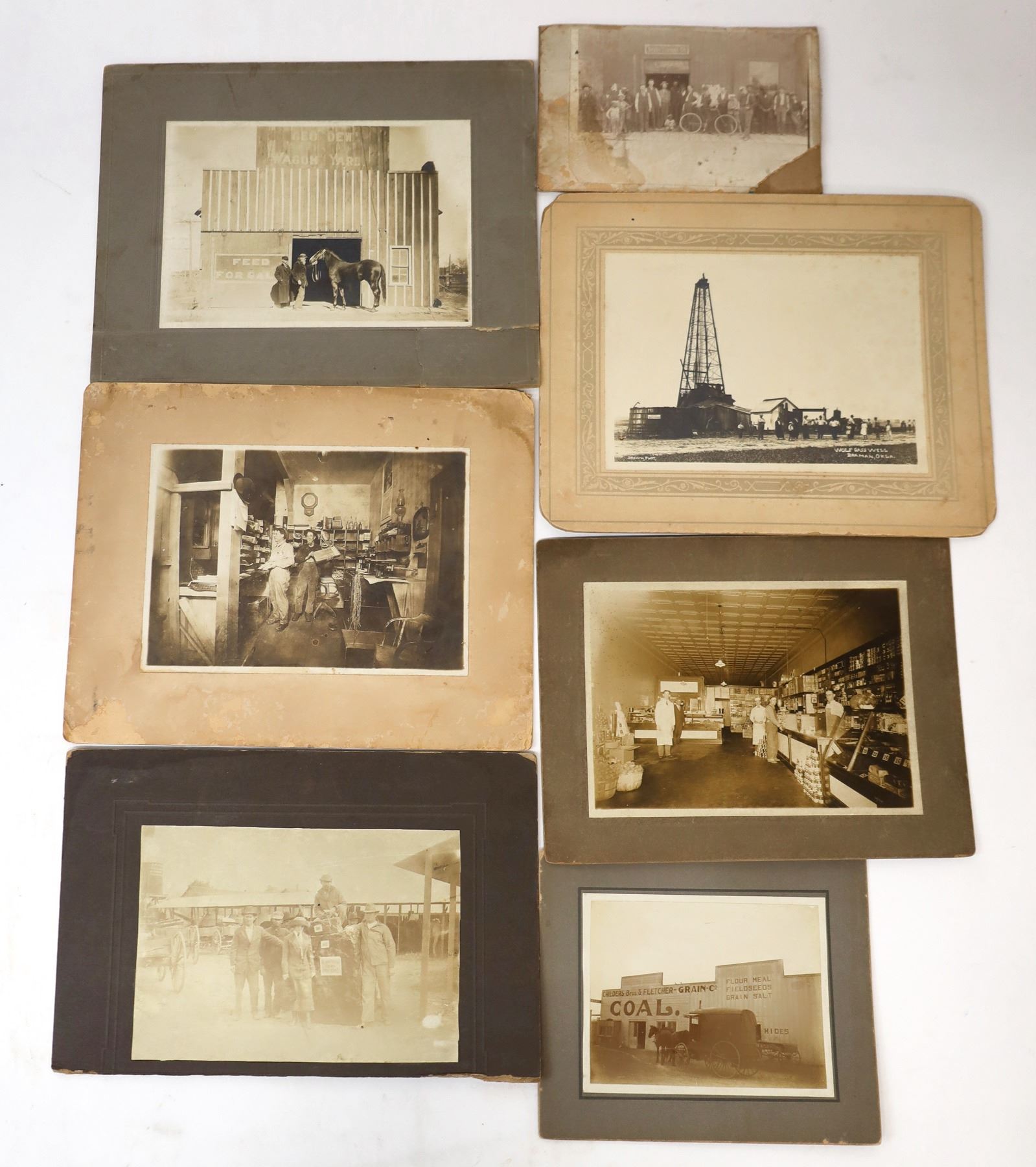 Group of seven antique photographs from Oklahoma. These photographs are of a gas well, a group of coal miners, and several shots of exteriors and interiors of general stores. Most likely from the late 1800s or early 1900s. Various sizes, largest is 10 x 8 inches.