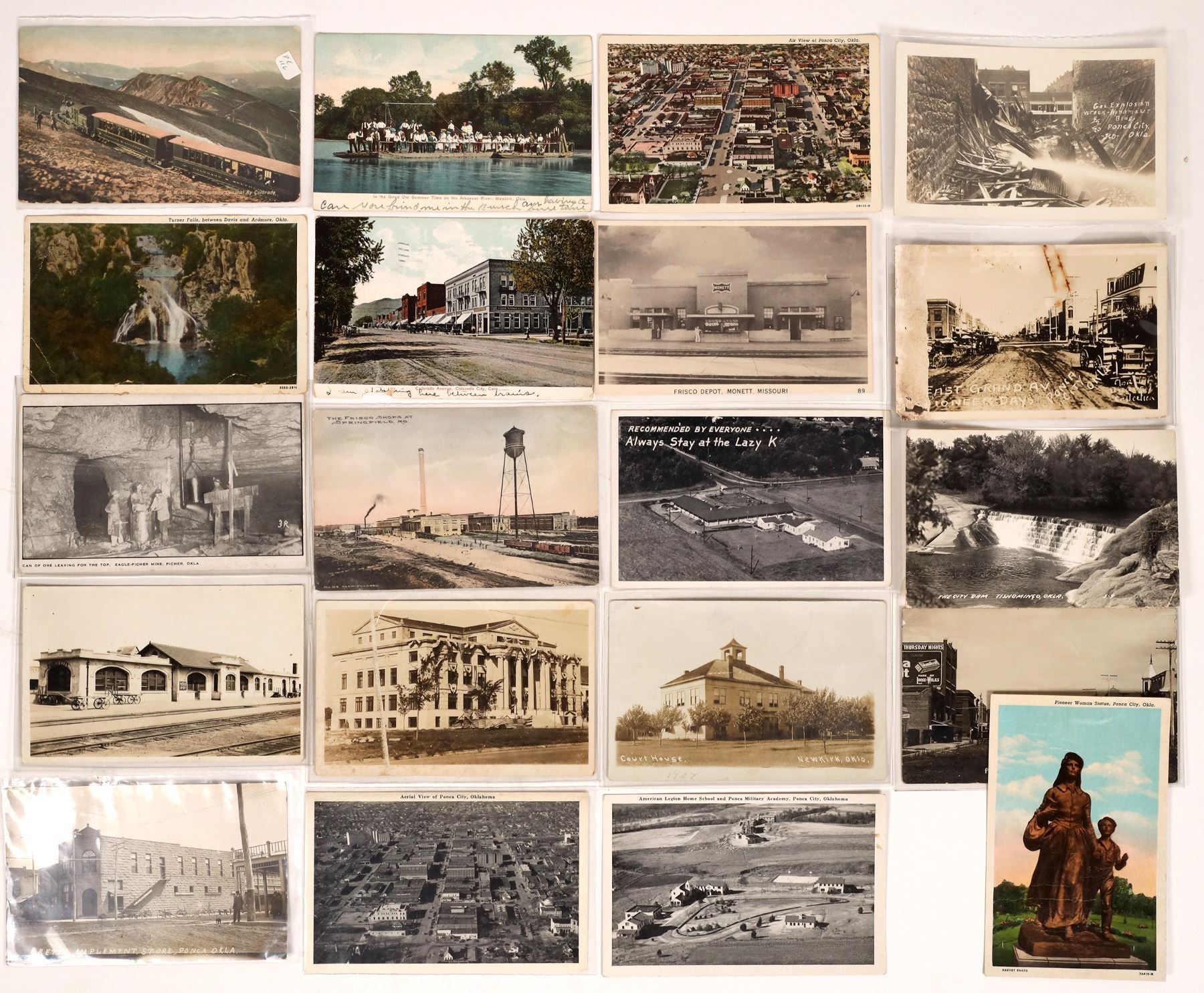 Lot of 20. Mostly Ponca. Real photo cards include Ponca Military Academy, Ponca City aerial view, Bretts Implement store of Ponca, Grand Avenue Ponca City, Newkirk courthouse, Ponca train station, dam at Tishomingo, Lazy K Motel. One hand colored Frisco Shops of Springfield, Eagle Picher Mine, East Grand Avenue at Ponca, gas explosion at Ponca, Frisco depot at Monett, 1908 Newkirk on the Arkansas River and Colorado Southern high up on a summit!