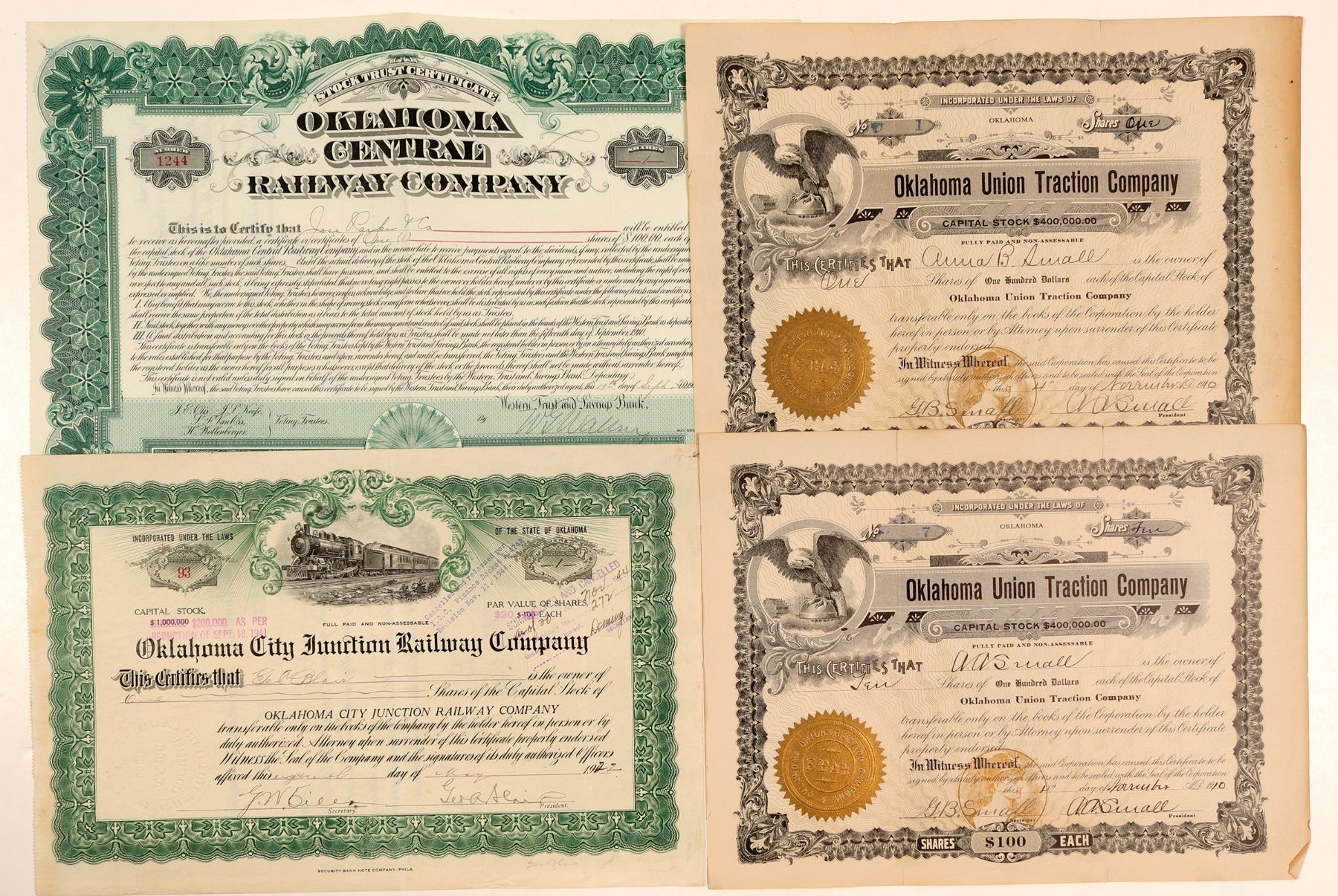 4 certificates. 1. Oklahoma Central Railway Co. incorp. 1904 Oklahoma Territory. #1244 Stock Trust Certificate, I/U, 1 share @ $100 par issued to Jose Parker & Co Sept. 19, 1906. GREEN, embossed seal, no vignette. EF. Western Bank Note Co printer. 2. Oklahoma Union Traction Co. two certificates: #1, I/U, One shares $100 par issued to Anna B. Small Nov. 4, 1910 signed A.A. Small President and #7, I/U, Five shares issued to A.A. Small Nov. 4, 1910, signed A.A. small President. BLACK, gold corp. embossed seal, Vignettes: bottom allegorical female looking l-r and top eagle on dome wings spread. GOES printer. VF. 3. Oklahoma City Junction Railway Co.incorp on June 19, 1909. $93, I/C, One share @ $100 par issued to Geo. Blair May 18, 1922 signed Geo. A. Blair President. GREEN, embossed seal, vignette 4-4-2 #319 heading r-l. Security Bank Note Co. printer. EF Ken Prag Collection
