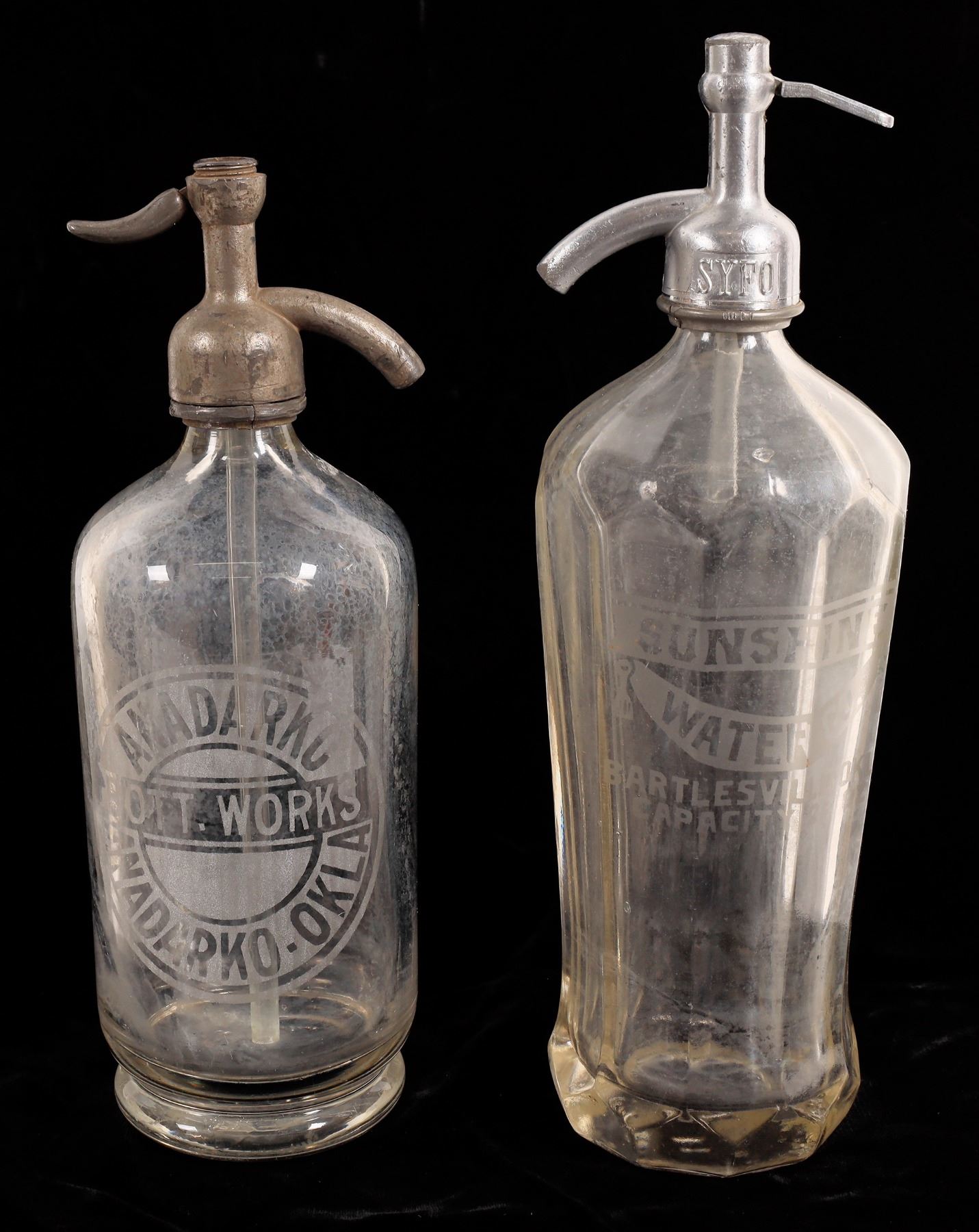 2 clear Oklahoma seltzer bottles. Anadarko Bott. Works, Anadarko, Okla, partial syphon. Tapered multisided Sunshine Water Co. Bartlesville, Okla. Oklahoma
