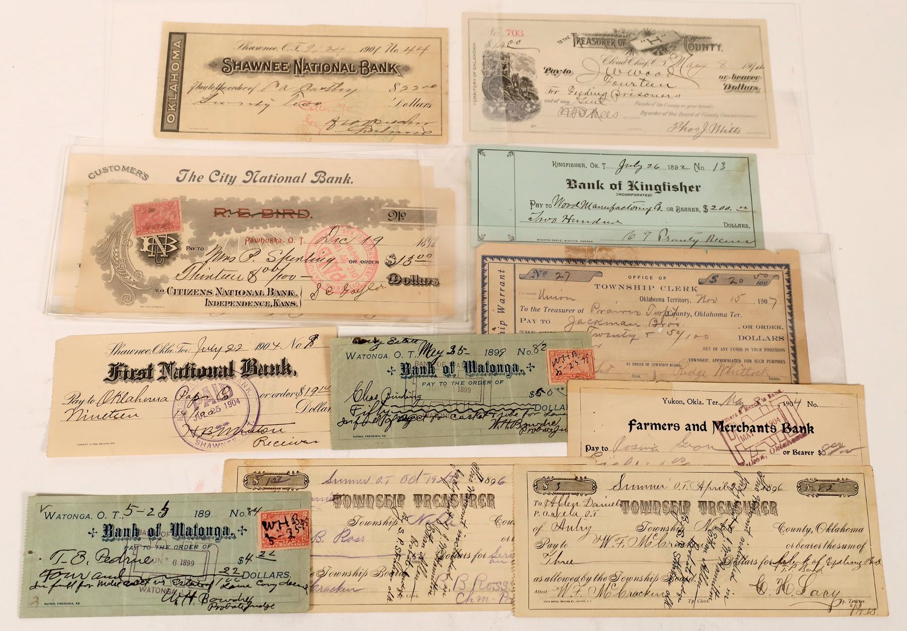 11 pieces. 1) Lawton City National Bank with farming pictorial. 2) Pawhuska 1898. 3) Kingfisher 1892. 4-6) Summit, Autry and Cloud Chief treasurer check. 7-8) Shawnee. 9-10) Watonga. 11) Yukan. 12) Union Township. 13) Anadarko Sunny Brook Distillery.