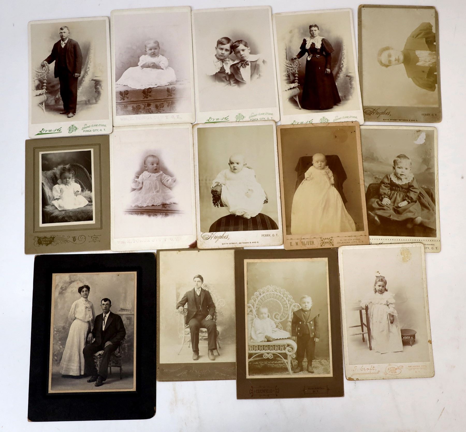 Lot of 15 portrait photographs from studios in towns designated as Oklahoma Territory. These towns include Ponca City, Enid, Perry, Oklahoma City, Alva, and Blackwell. Most likely from the late 1800s or early 1900s. Various sizes, 6 x 8 inches. Good condition.