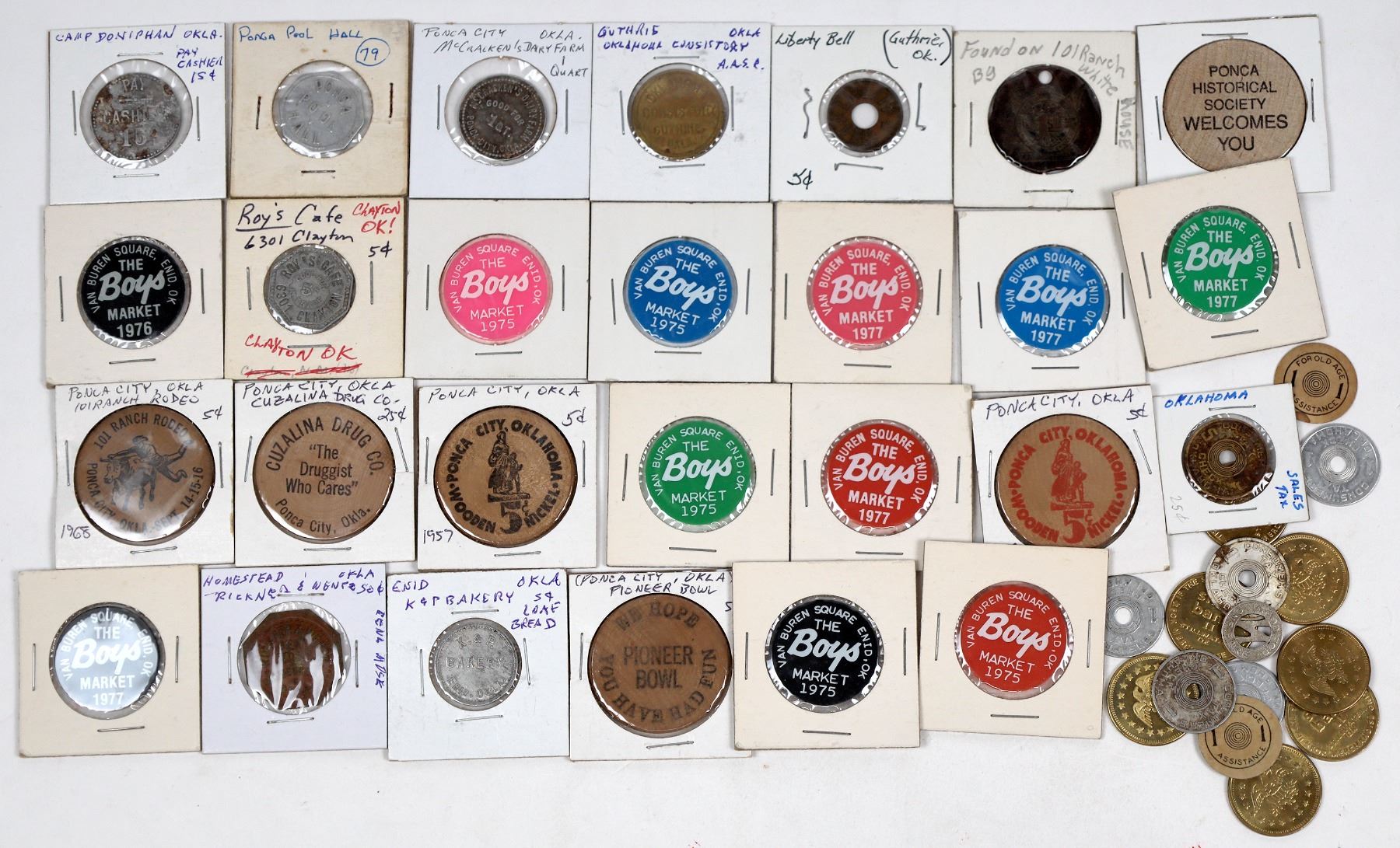 Lot of fifteen Oklahoma tokens: Homestead: Rickner & Wentz; Clayton: Roy's Cafe; Camp Doniphan: Pay Cashier; Guthrie: Oklahoma Consistory; Guthrie: Liberty Bell; Enid: K & P Bakery; Ponca City: McCracken's Dairy Farm; Ponca City: Ponca Pool Hall; Tulsa: First National Bank; Ponca City: six wooden nickels.