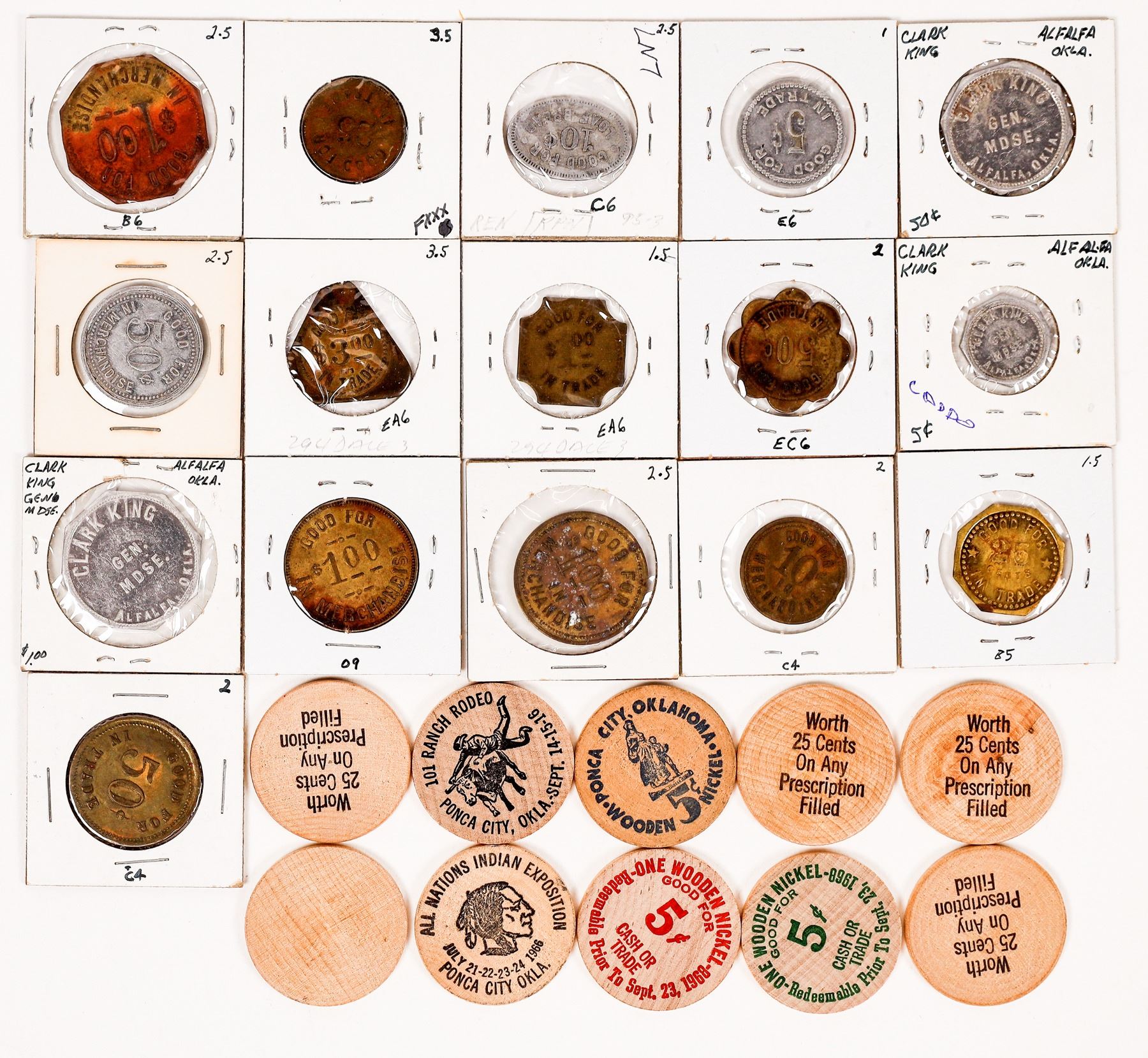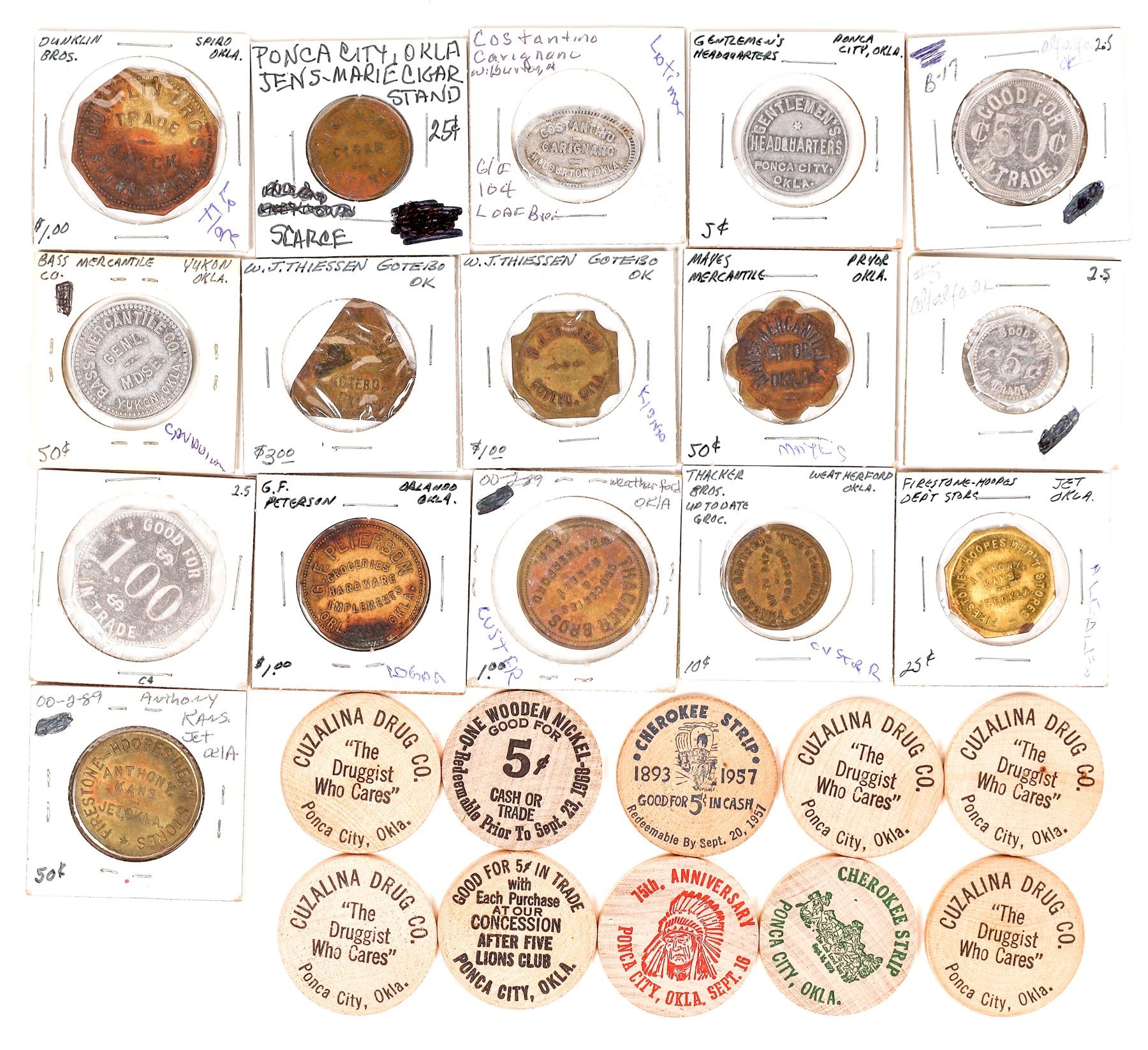 Over 25 tokens and wooden nickels from Oklahoma. Alfalfa: Clark King (3 different); Jet: Firestone-Hoopes Dept. Store (2 different); Weatherford: Thacker Bros.(2 different); Orlando: G. F. Peterson; Pryor: Mayes Mercantile; Gotebo: W. J. Thiessen (2 different); Yukon: Bass Mercantile Co.; Spiro: Dunklin Bros.; Wilburton: Costantino Carignano; Ponca City: Gentlemen's Headquarters, Jens-Marie Cigar Stand. Ten Ponca City wooden nickels.