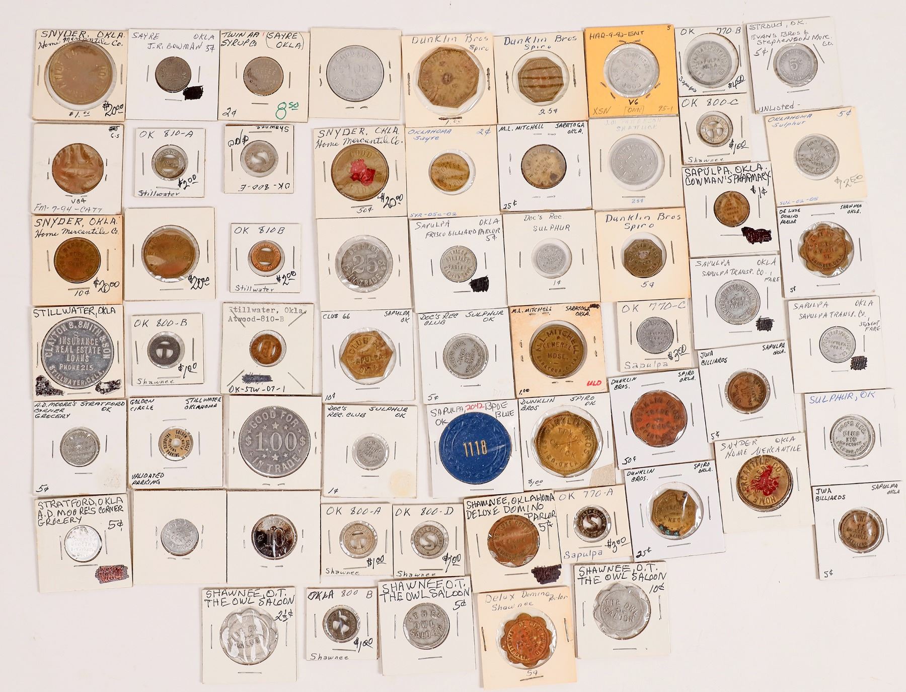 Lot of 59 tokens from Oklahoma: Sapulpa (10); Saratoga (2); Sayre (3); Shattuck (3); Shawnee (12); Snyder (6); Spiro (6); Stillwater (5); Stratford (6); Stroud (1); Sulphur (4).