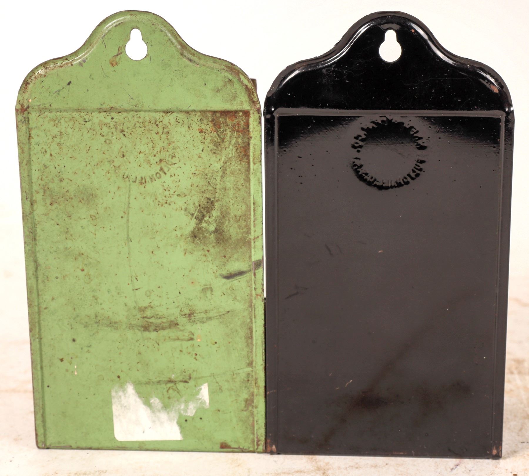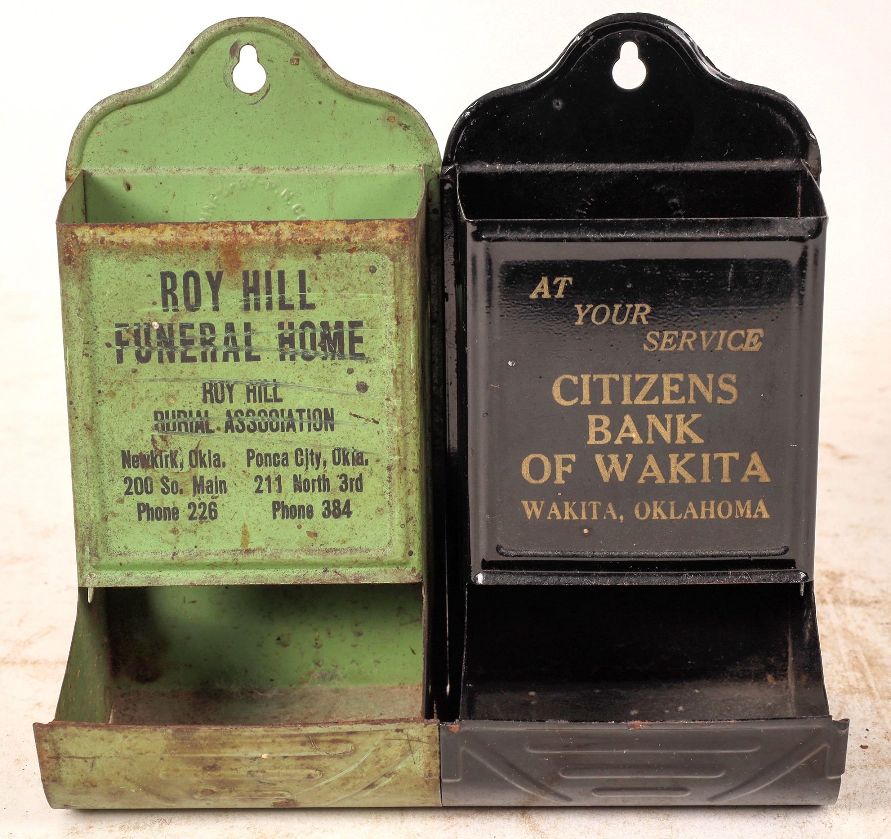 2 Oklahoma wall match box holders. Green Roy Hill Funeral Home, Newkirk and Ponca City, 6", some rust. Black Citizen's National Bank, Wakita, 6", nice condition! Oklahoma Gary Bracken Collection