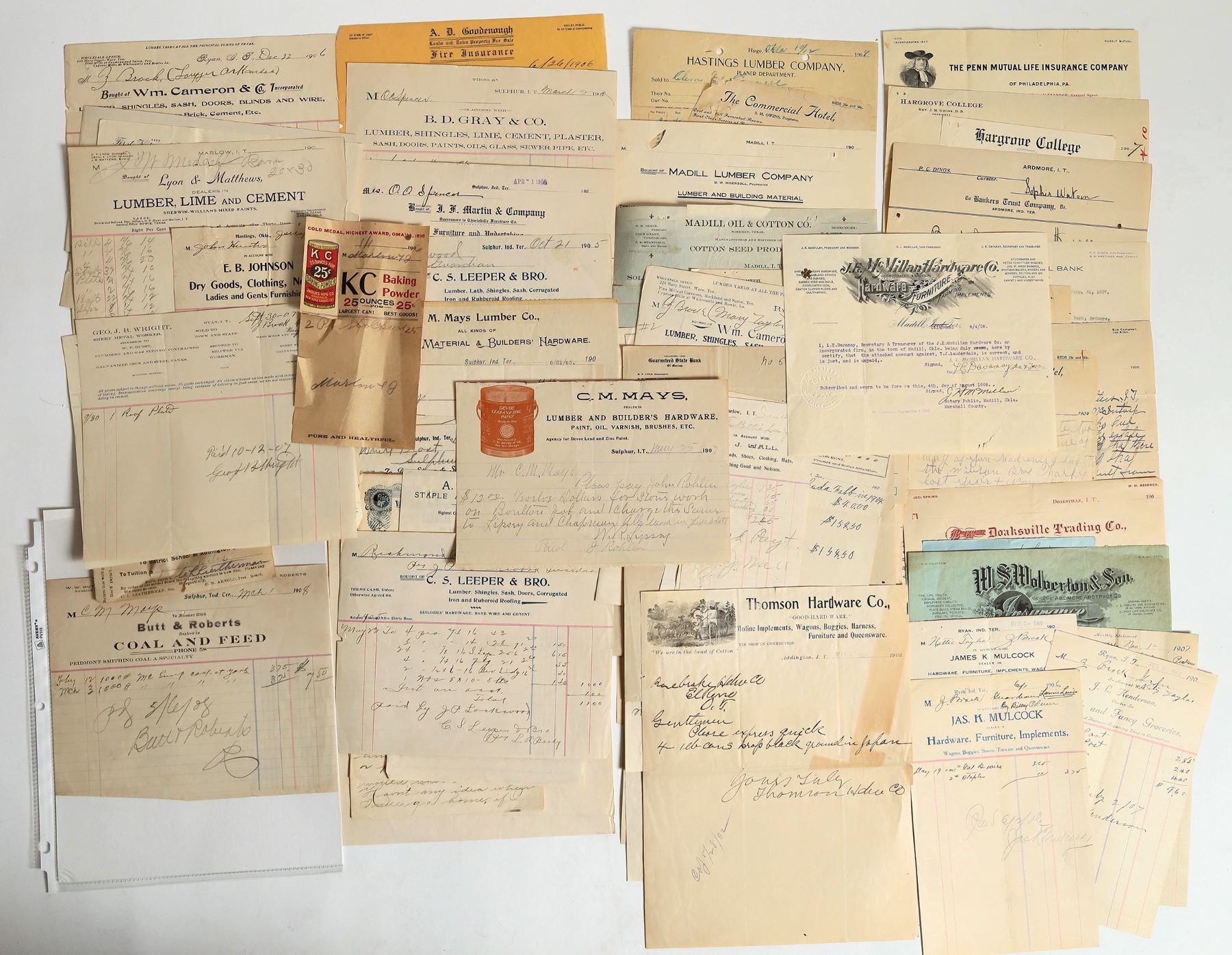 Lot of 60+. Most pieces are c.1900-1915. Includes billheads, letterheads, and receipts from: Jefferson County (Hastings, Ryan, and Addington); Stephens County (Duncan and Marlow); Pushmataha County (Antlers); Murray County (Sulphur and Hickory); Marshall County (Madill, Woodville, and Kingston); Choctaw County (Doaksville, Fort Towson, and Hugo); and Carter County (Ardmore). Please inspect.