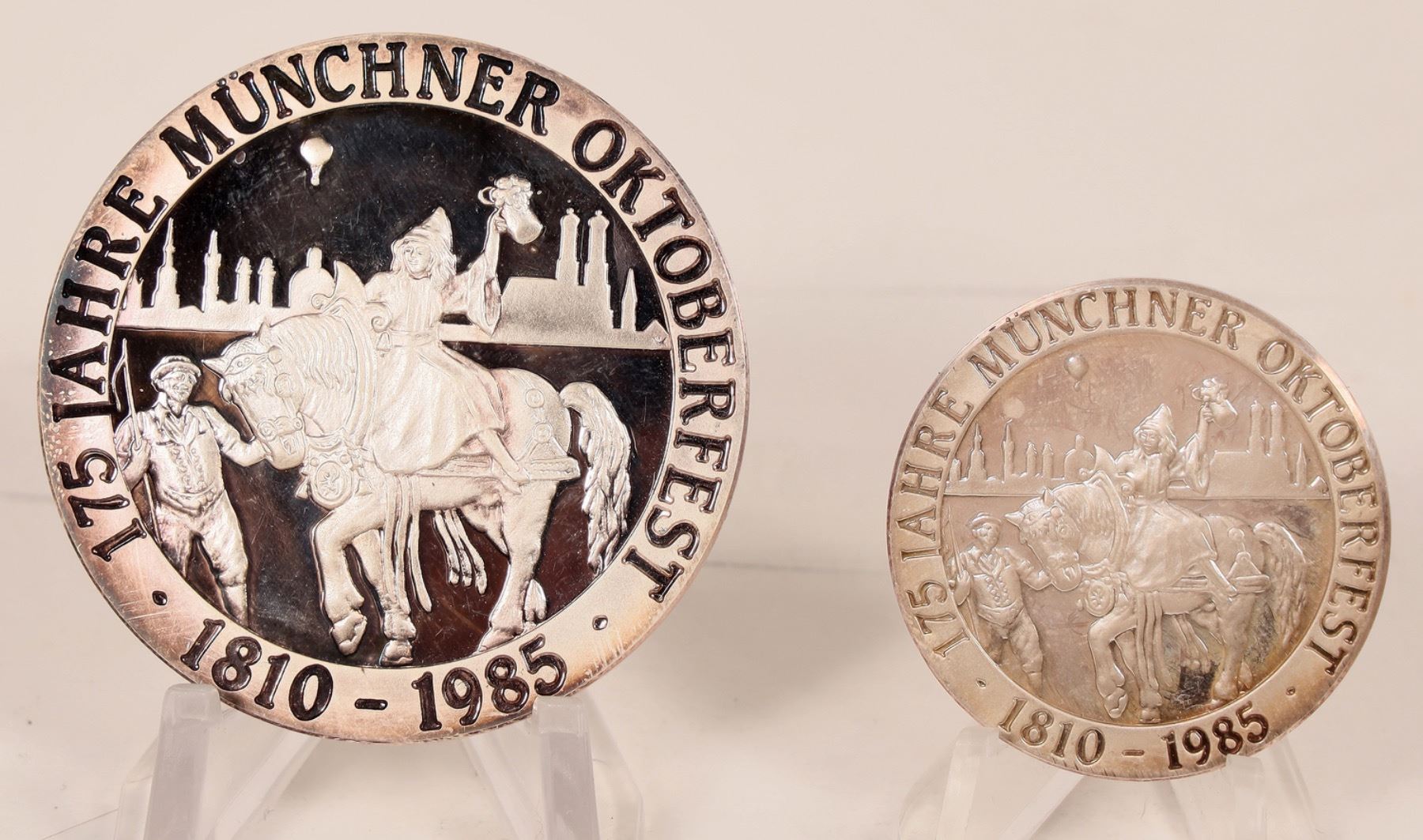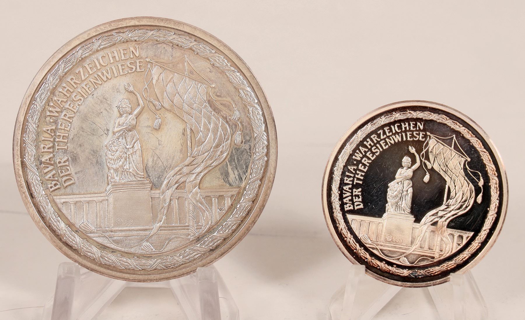 Two silver medals from Munich's Oktoberfest: 1) 175 Jahre Munchner Oktoberfest / 1810-1985 // Bavaria Wahrzeichen / Der Theresienwiese. 50 mm; 34.8 grams. 2) same but smaller: 35 mm; 14.9 grams. Salvatore Falcone Collection