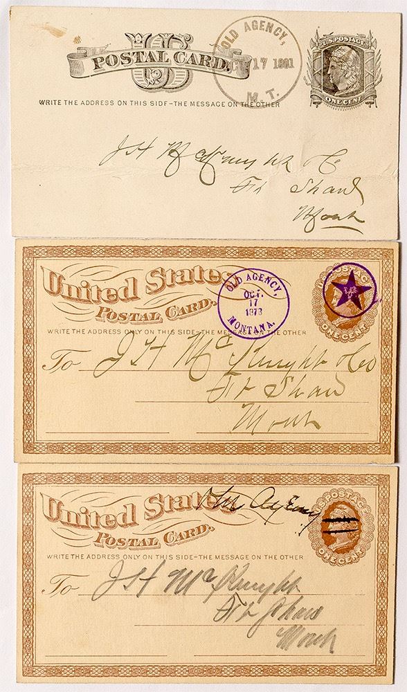 1) Manuscript. Number 1 in Shellen & Dunn. 2) 1879 number two star in circle purple cancel and killer. Amazing example. 3) Number 3 with very strong strike. A great collection of the three known territorial styles! (Svoboda Collection) City: Old Agency State: Montana Date: c1880 HWAC# 35248