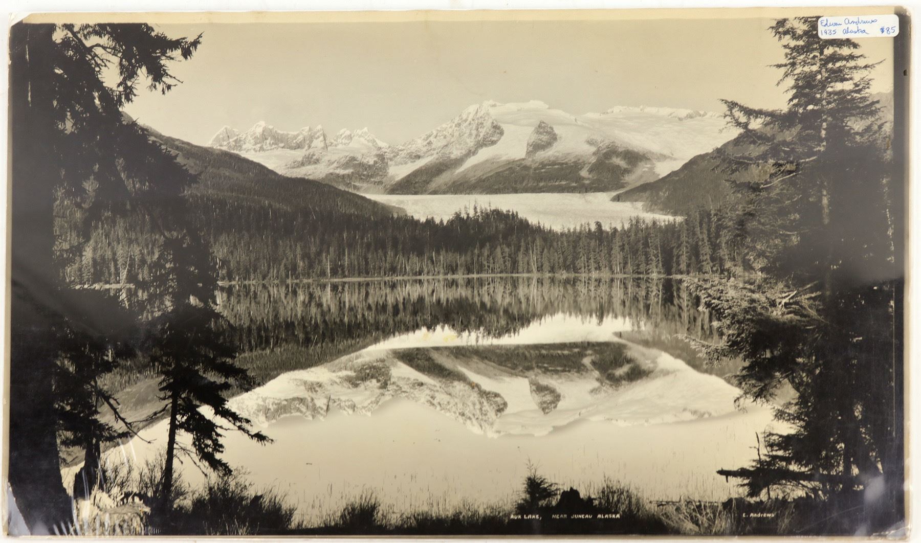 Vintage b&w photograph of Auk Lake w/Mendenhall Glacier in background. Photo taken by Ed Andrews. 1935. Mounted on cardboard backing. Dimension: 20" wide, 12" high. Note: Ed Andrews (1872 -1937) was the official photographer for several organizations including the Alaska Steamship Line. Retailers throughout Alaska distributed his photos. City: State:Alaska Date: