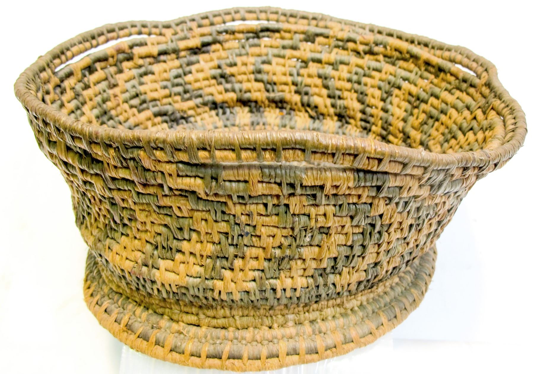 5" high, ten inch diameter, footed basket with separations made at the second rod for decorative purposes. Rough green lightning patterns all around. Pollock Collection. Geff Pollock Collection