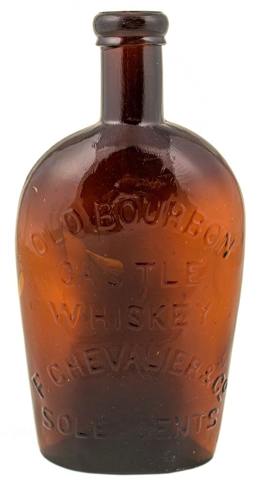 Old Bourbon Castle Whiskey flask. F. Chevalier & Co., Sole Agents. Very rare, and one of the most desirable of all California whiskey flasks. Double roll applied top collar, pint. Dark amber. This is one of the all-time great western whiskey flasks. This flask comes to us from an important California collection. Thomas originally rated it as one of the top two Western whiskey flasks. Approximately six specimens are known. Flask has outstanding physical display appeal. Very minor roughness or wear on the bottom right edge at the front of the bottle. City: San Francisco State: California Inventory Number: 38159