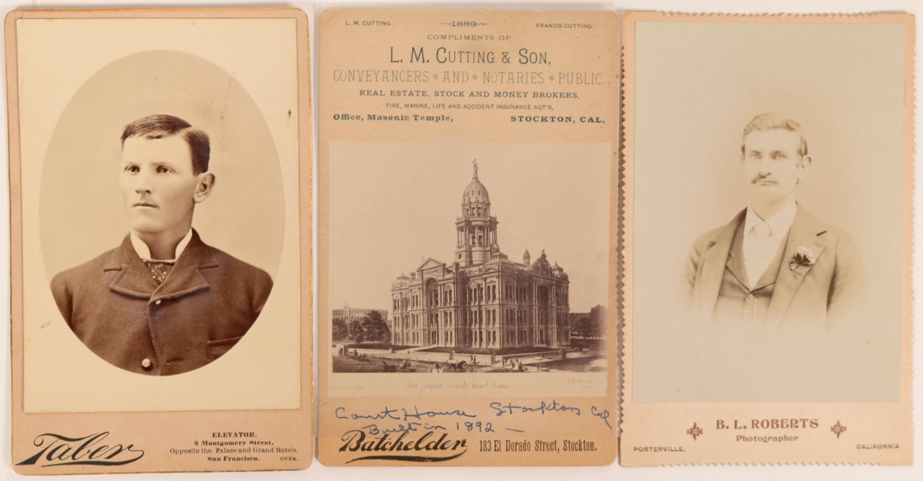 Three cabinet cards from the late 1800's including a portrait taken by Tabor Photography in San Francisco. There's also one of the Masonic Temple in Stockton, CA.