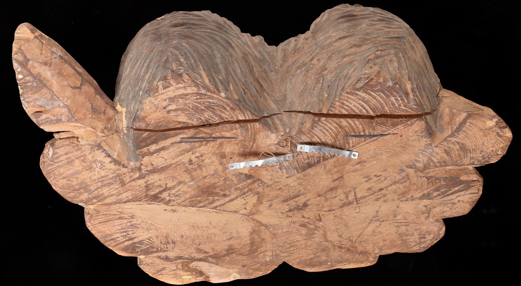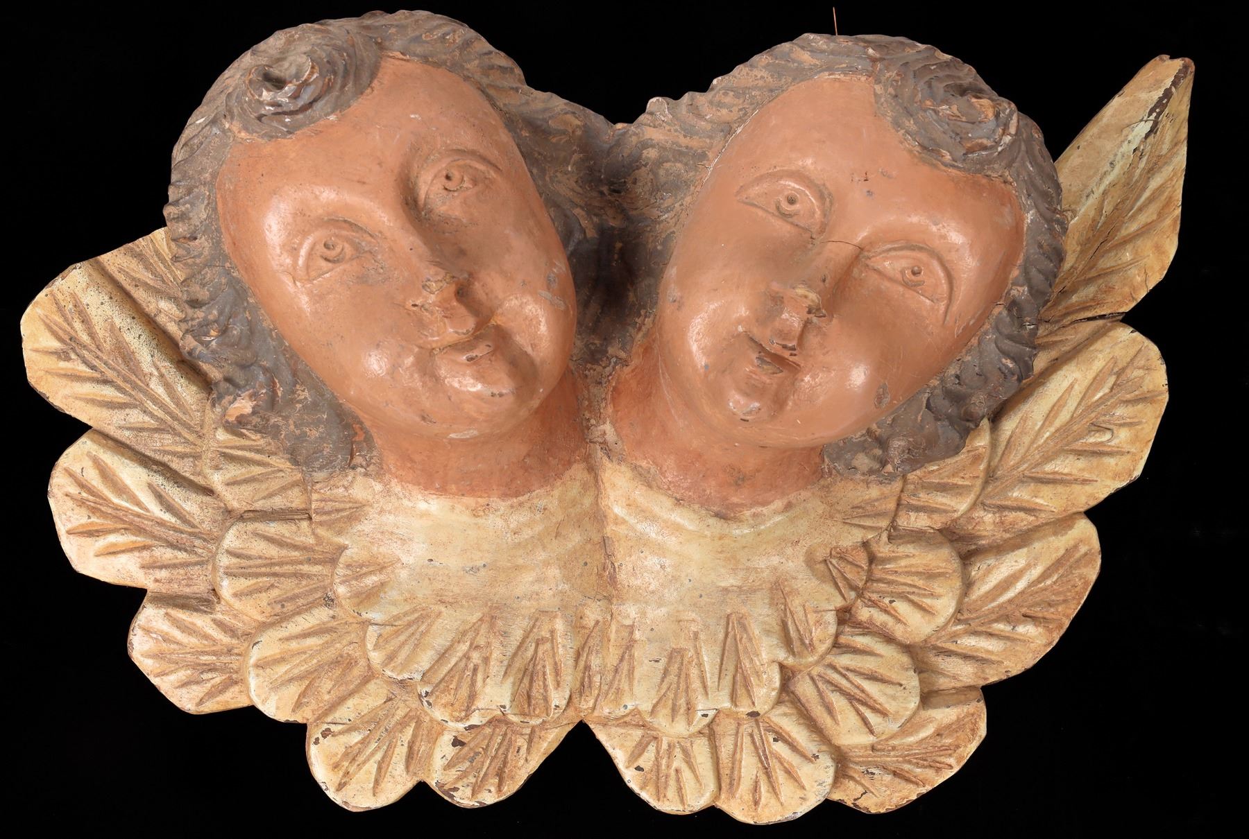2 mirror imaged heads on a carved wood figurehead in the style of an old sailing vessel. This appears to be a wall mount display piece for a saloon near a shipping port. c. 19th century. 12x18" with left upper corner of back cleanly sawn off. Please inspect.