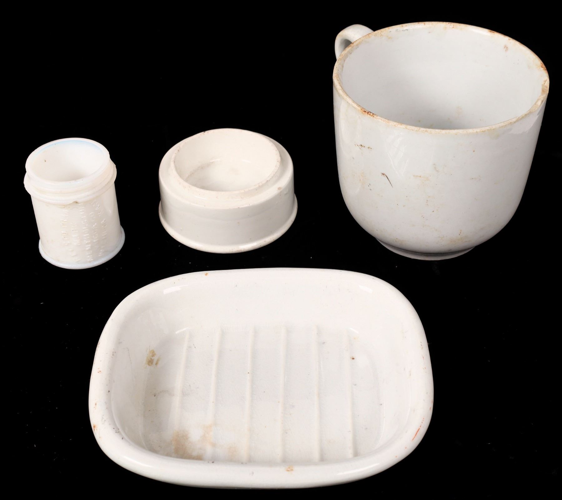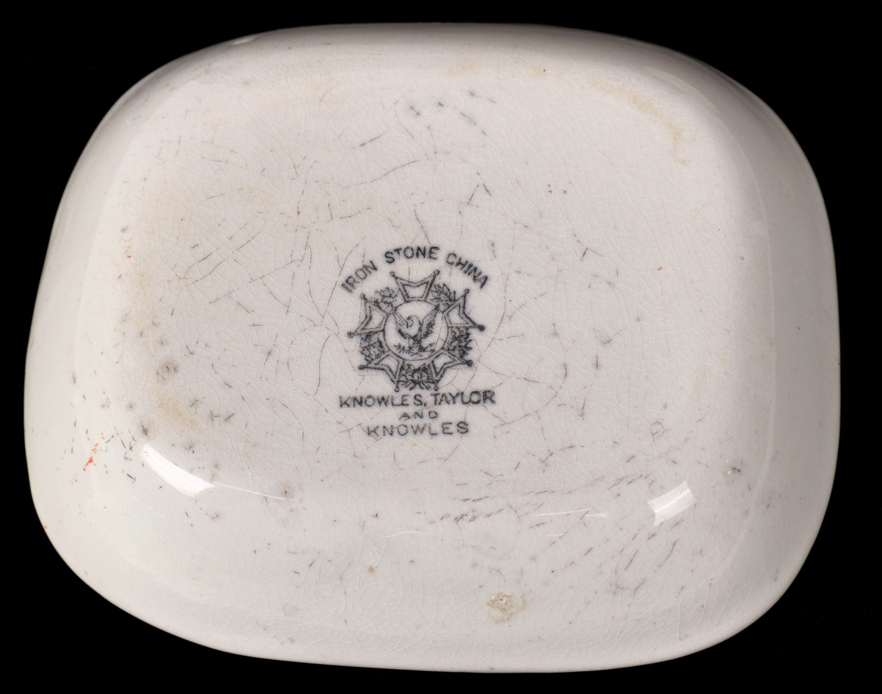 Old China and related items. Small embossed mentholated? container bottom 1.75" with thread chip. Container base 1.25x2.5". Knowles, Taylor and Knowles soap dish 4.25x5.25". Unmarked cup 3.25x4.5" with lip chips. Please inspect.