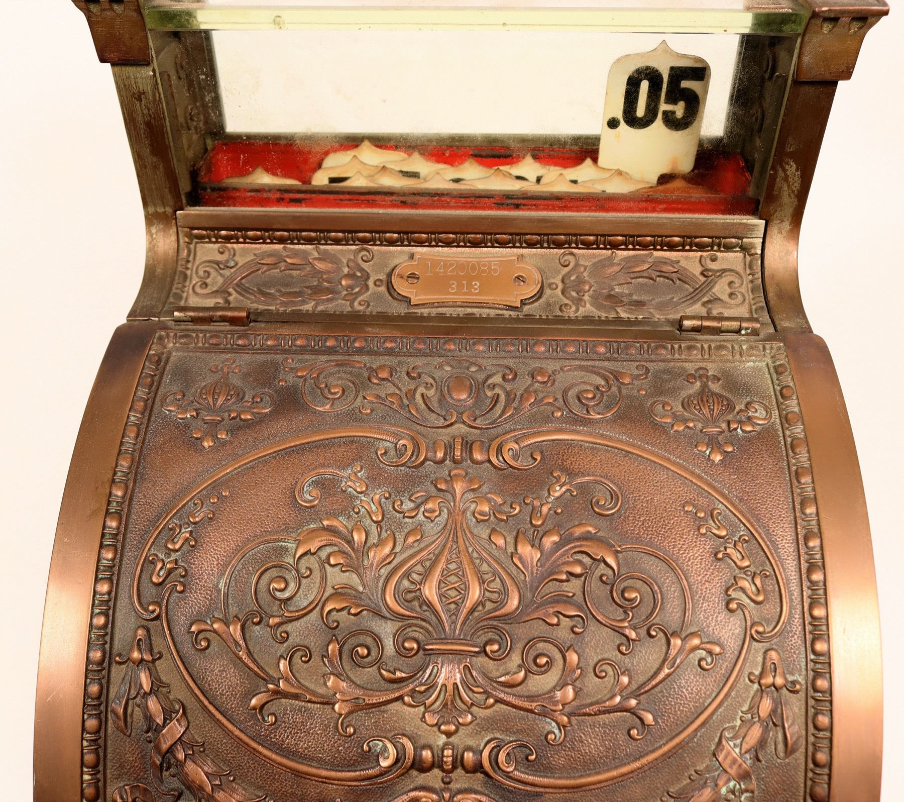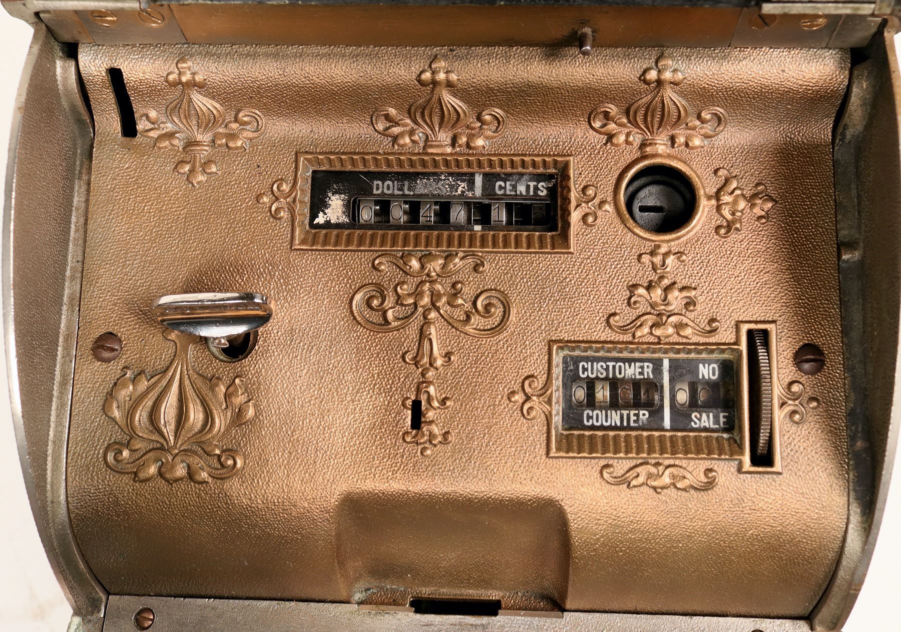 This small but beefy (80 pound) beauty from National Cash Register is the 313 Candy store model, introduced in 1911. Its ornate brass and nickel carvings and finish make it one of the most desirable of the early registers. Serial number 14020085 Model 313.