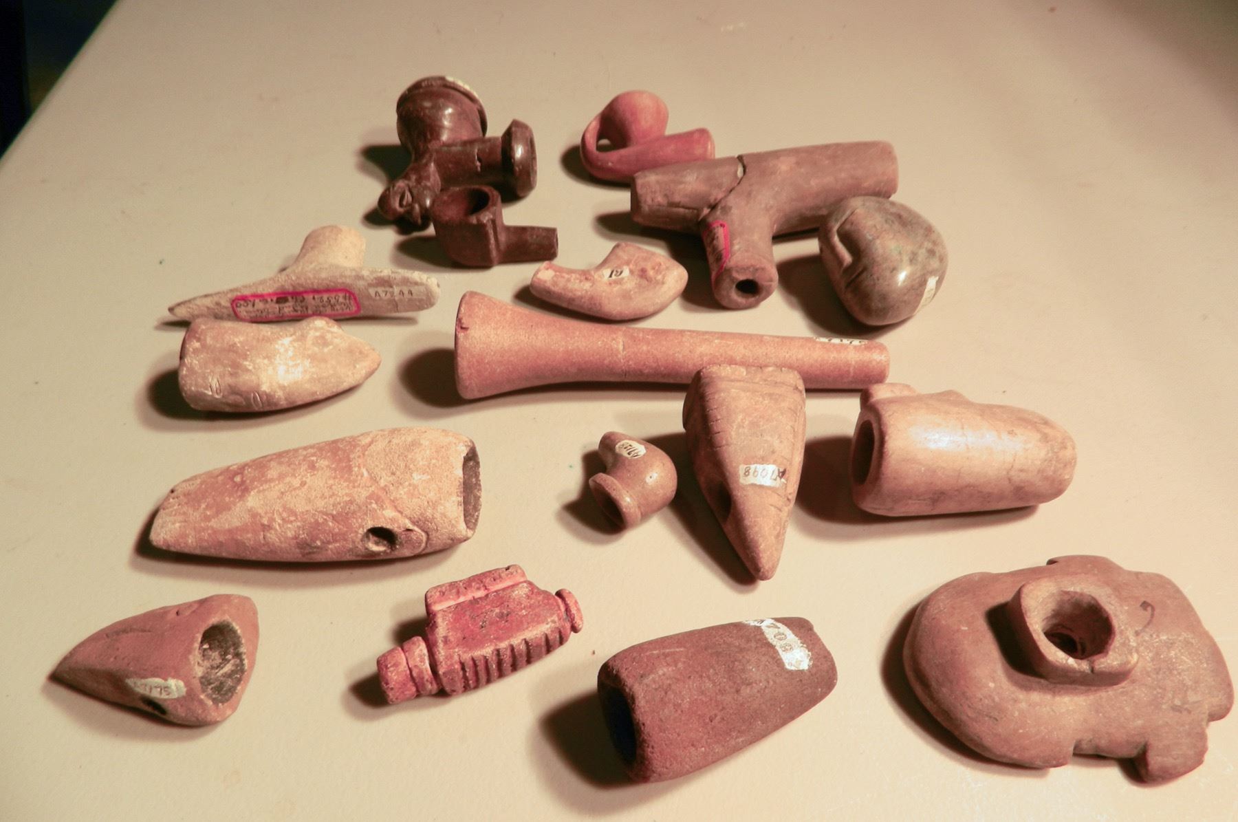 Approx 16 old clay pipes from American southeast, some with old museum labels