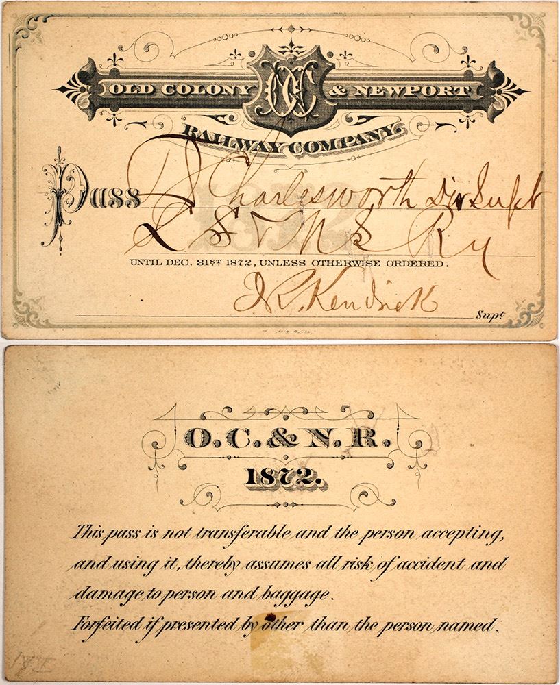 Issued to TJ Charlesworth, supt. of Lake Shore & Michigan Southern Railway. Signed by J.R. Kendrick, superintendent. Ornate logo and border. Some soiling and toning. Formed in July 1863 when the Old Colony and Fall River Railroad merged with the Newport and Fall River Railroad, which had been incorporated in 1846 to build a road from Newport, Rhode Island to the Massachusetts state line at Fall River. Merged with the Cape Cod Railroad at the end of 1872. (Potter Collection) Date: Location: Rhode Island HWAC# 60345