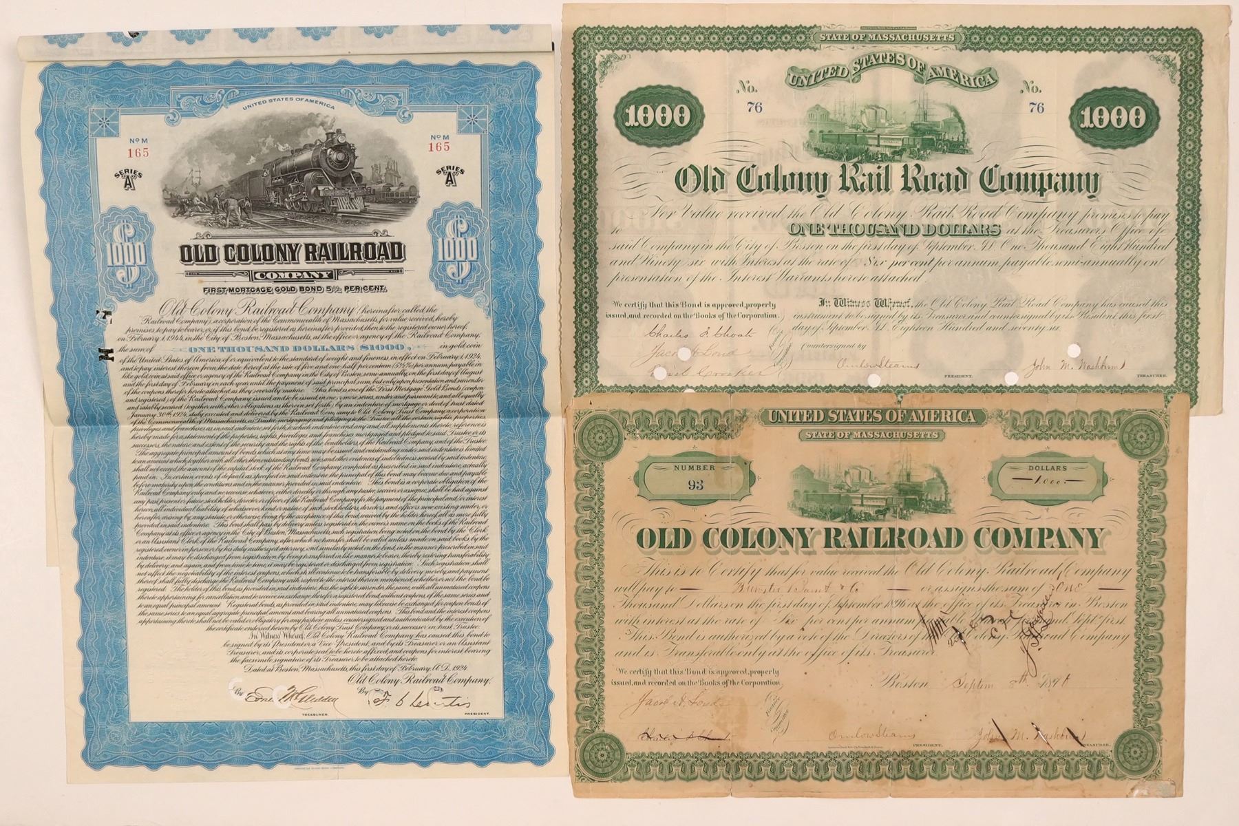 Three bonds. Founded 1863 Massachusetts. 1. #76, I/C, $1000, 6% Bond due 1896. Issued Sept. 1, 1876 signed John M. Washburn President and Uriel Crocker Finance committee. Green, embossed seal, vignette top train @dockside depot ships in background. American Bank Note Co. printer. Cancel punch holes, folds, no tears. 2. #93, I/C, $1000, 6% Bond due 1896. Issued Sept. 8, 1871(?) signed John M. Washburn President and Uriel Crocker Finance committee. Green, embossed seal, vignette top train @dockside depot ships in background. American Bank Note Co. printer. 3. #165, I/C, $1000, 5 1/2 % First Mortgage Gold bearer bond due 1944. IssuedFeb 1, 1924. Blue, embossed seal, vignette top 4-6-2 and cars, men working on rails. 'GOLD" blue underprint oval, coupons 6-40 attached (vignette loco frontal). American Bank Note Co.VF.