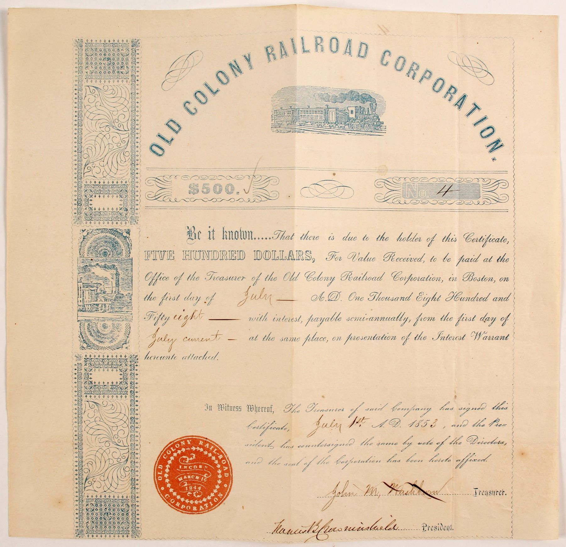 1 total certificates. Unlisted in Cox; signed the president and treasurer, both illegible. In good condition, some discoloration. The Old Colony Railroad (OC) was a major railroad system, mainly covering southeastern Massachusetts and parts of Rhode Island. It operated from 1845 to 1893. Old Colony trains ran from Boston to points such as Plymouth, Fall River, New Bedford, Newport, Providence, Fitchburg, Lowell and Cape Cod. Prag Collection.