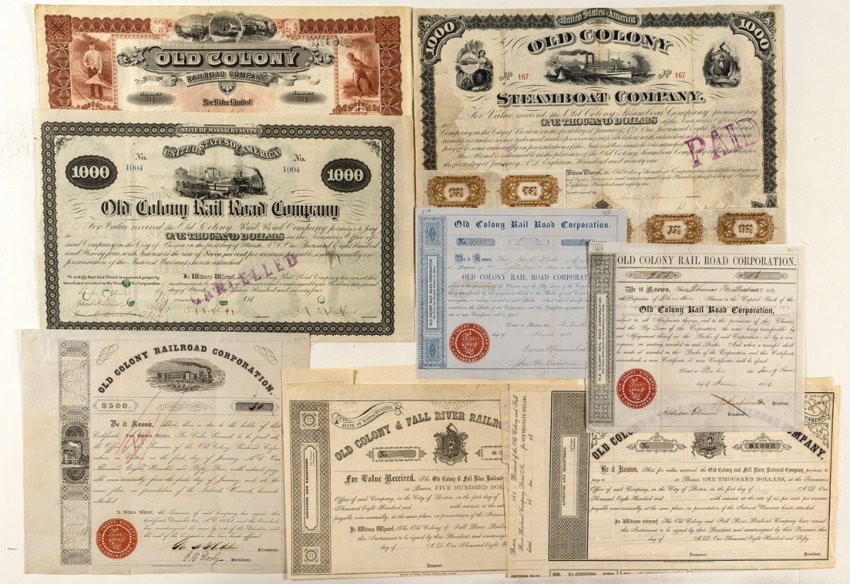 Lot of eight. 1) Two very early & different stocks for Old Colony Rail Road Corporation: 1846 (pen cancelled) and 1850 (blue font, not cancelled). 2) Very early bond from 1848, pen cancelled with locomotive vignette. 3) Two different larger bonds: $1,000 issued 1874 (punch and stamp cancelled, 8 coupons, seaport vignette) and $10,000 issued 1923 (pen and punch cancelled, multiple vignettes). 4) $1,000 bond for the Old Colony Steamboat Company issued 1881 (stamped Paid, 7 coupons, steamboat vignette). 5) Two unissued bonds for Old Colony & Fall River Railroad Company: 1850 and 1860, each with 20 coupons. (Prag Collection) City: State: Massachusetts Date: 1846-1923 hwac# 33904