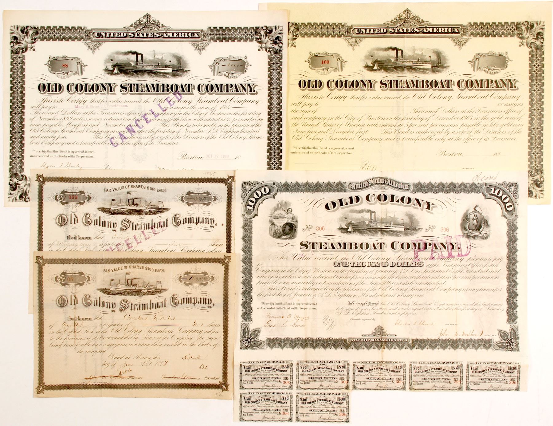 #306 $1000 bond signed by President Glivate? 4 stocks- I/C #65 Cornelius Bliss 10 shares 1877, I/C #165 EF Peirce 5 shares 1884, unissued yellow c. 1890's, I/C #88 Mary Grinnell 1890. Prag Collection. State: Massachusetts City: Date: HWAC# 83458