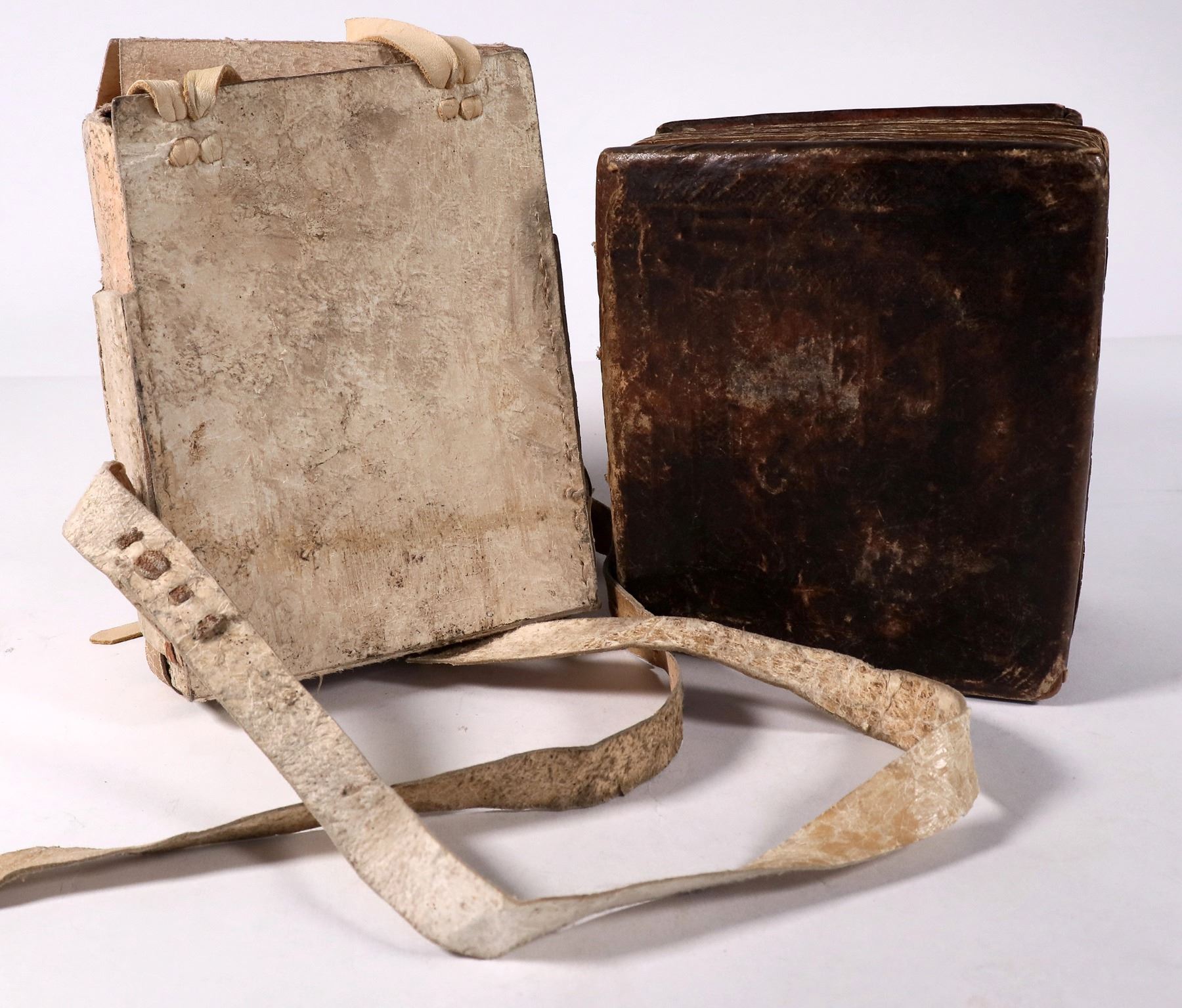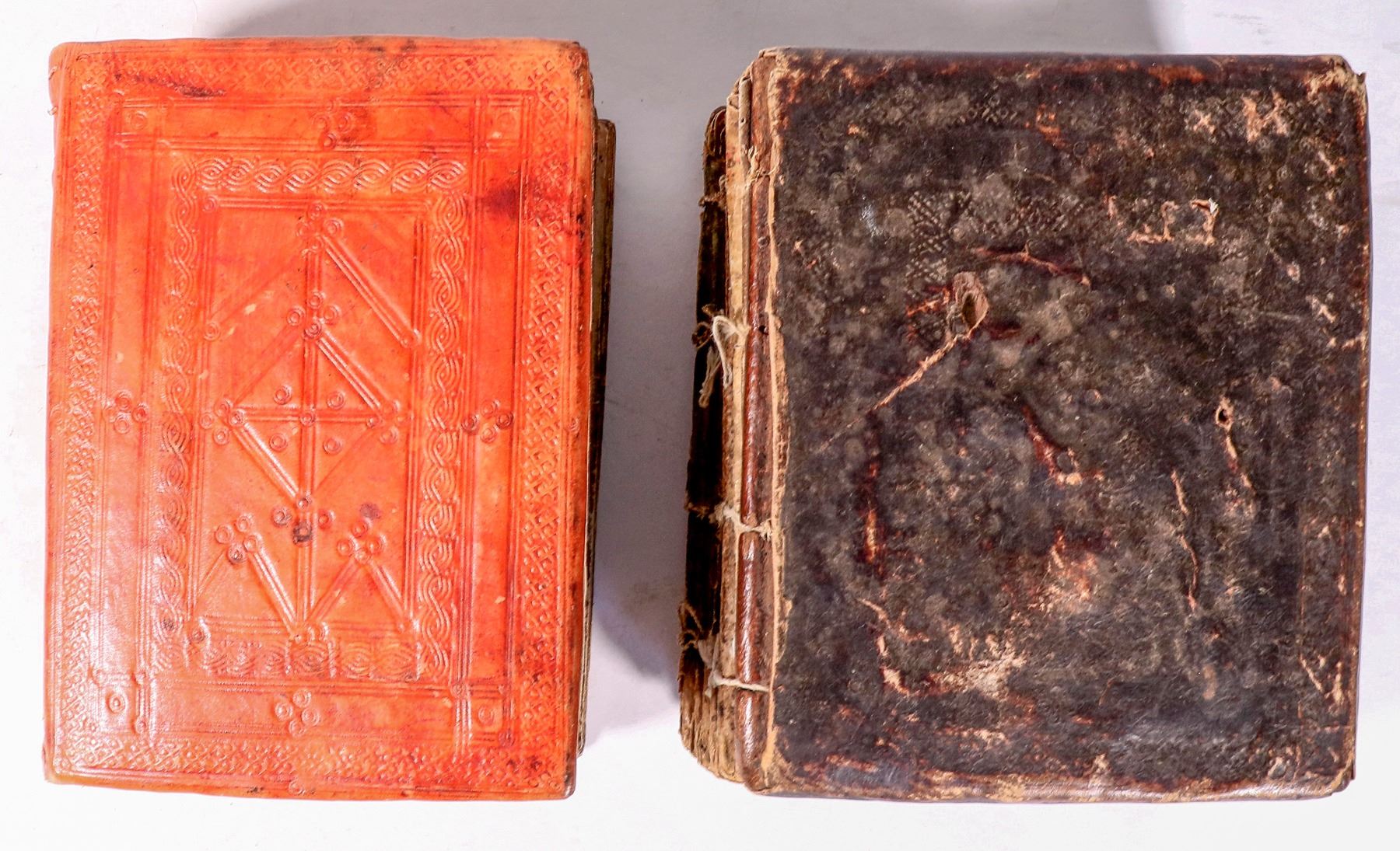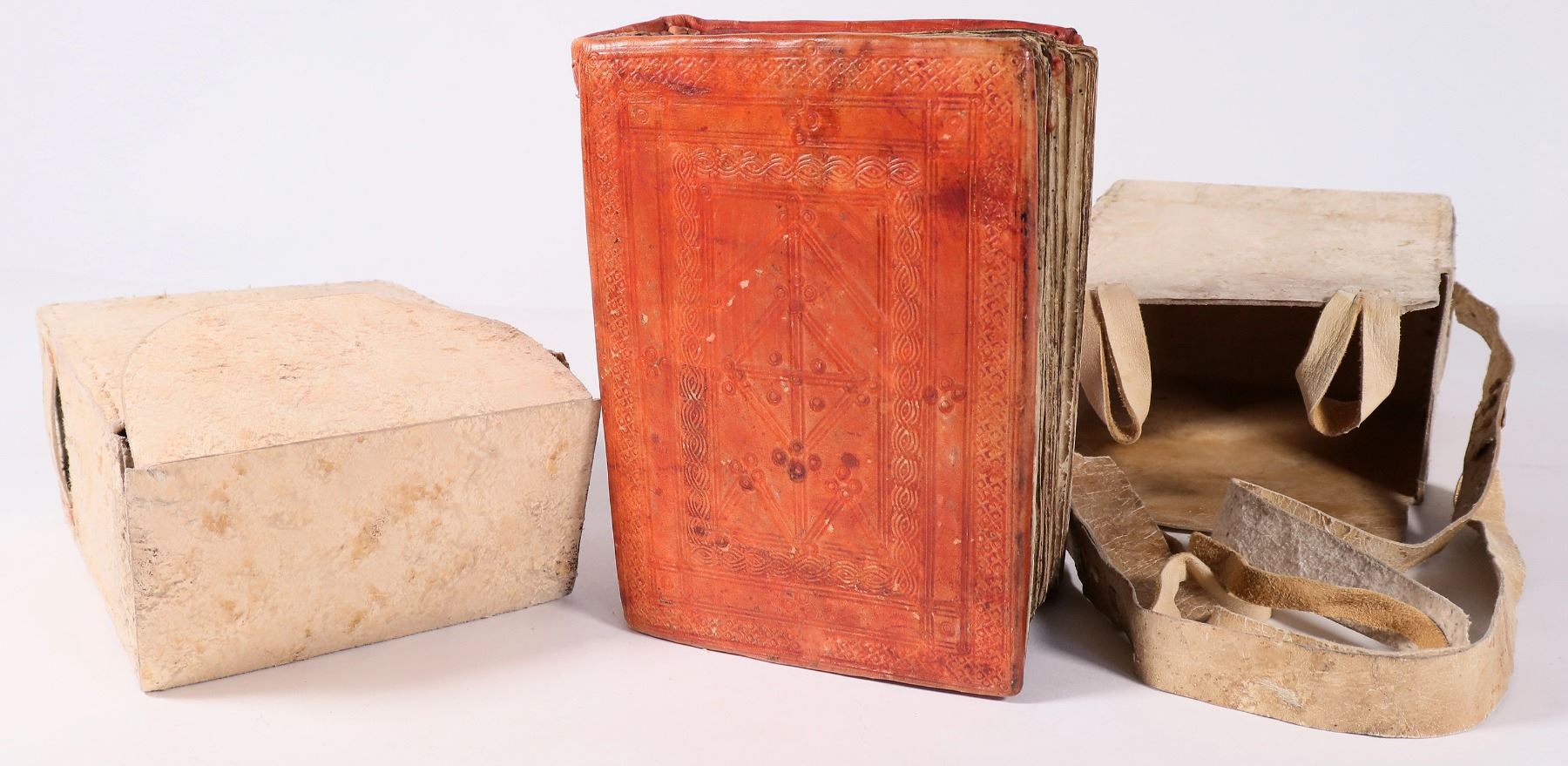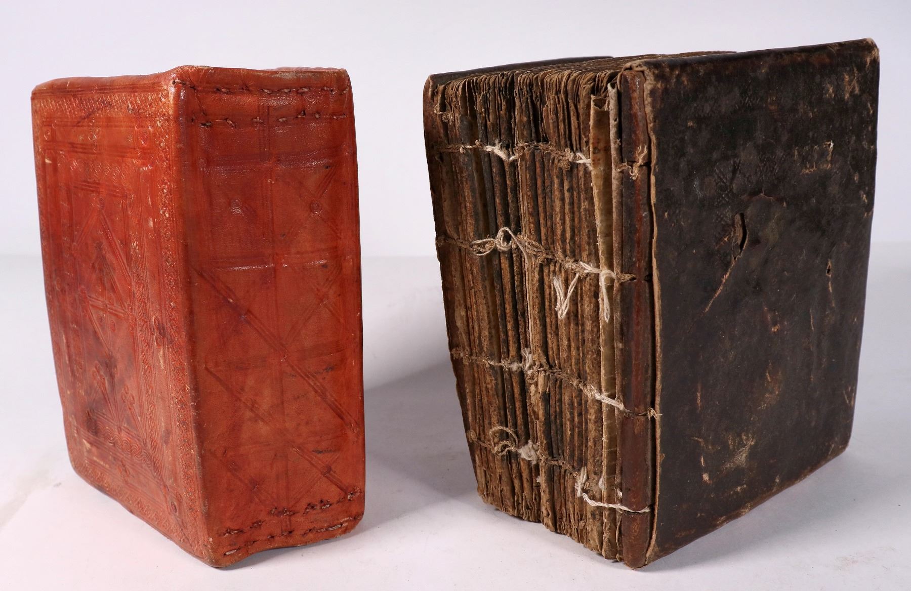 2 old Coptic bibles, likely written in Ethiopic. Obtained from a family of British descent who were missionaries in Ethiopia decades ago. Hand stitched and stamped red leather cover on bible on heavy pages, probably velum. Red and black letters. Some pages have upper red stitch. No illustrations. Housed in a 2 compartment skin case with straps. Not a lot of wear. 7x5.25x2.5" plus case. The other bible is likely much older. Dark brown covers with stamping over brown wood-1 holding by 2 threads, no spine, shows hand stitches where spine would be. Probably velum pages. Red and black letters. Pages have chocolate brown patina on edges. Light liquid stain on a few back pages. No illustrations. 7x6x3.25". Could be c. 1400's, we are unsure of the age of both bibles, both appear to be hand written.
