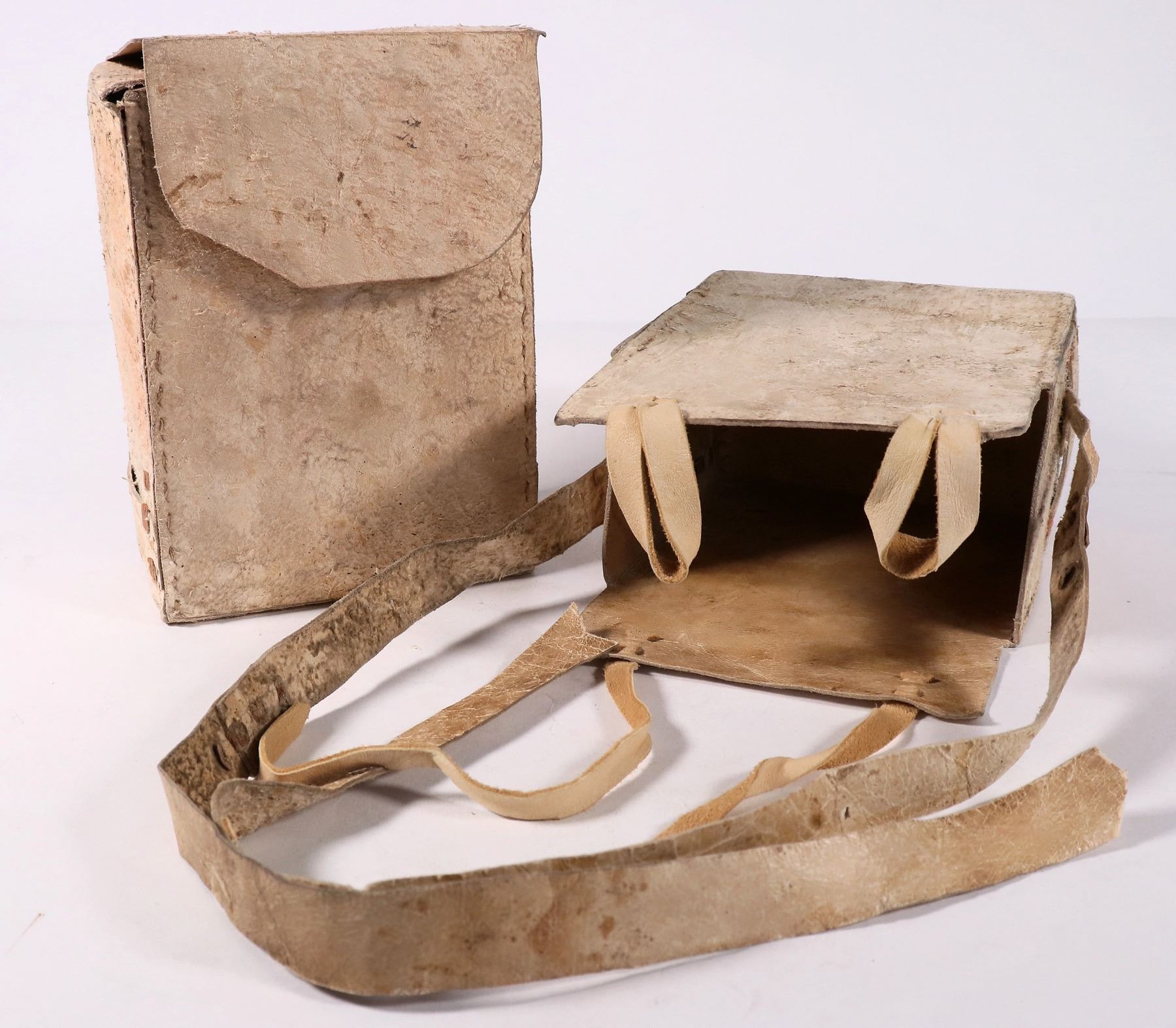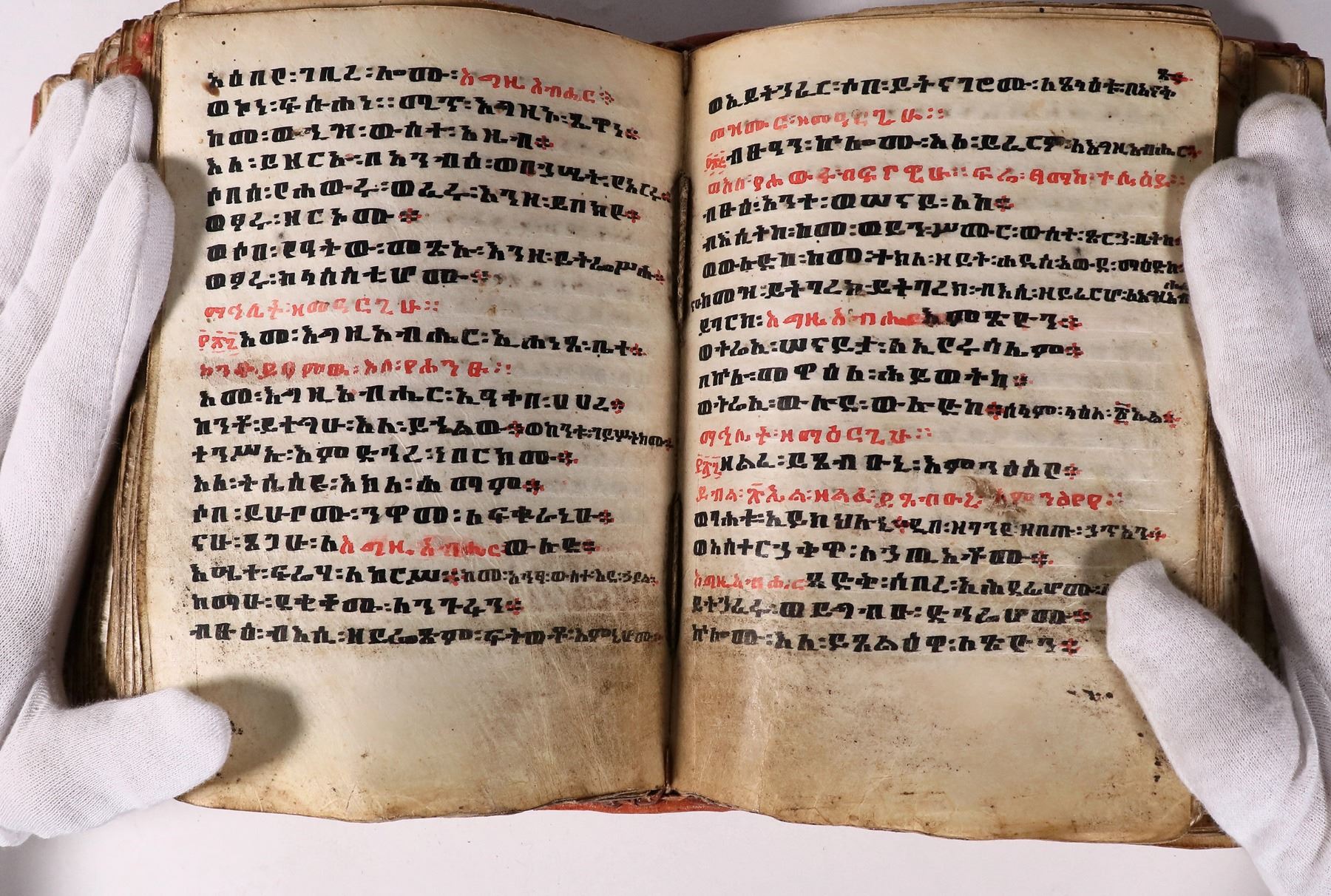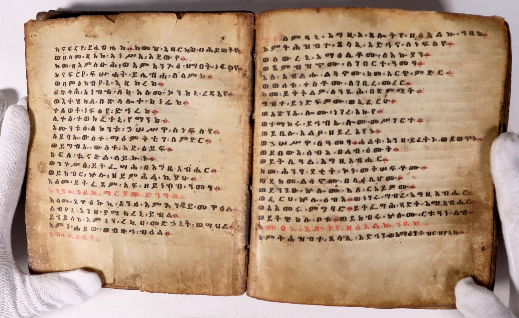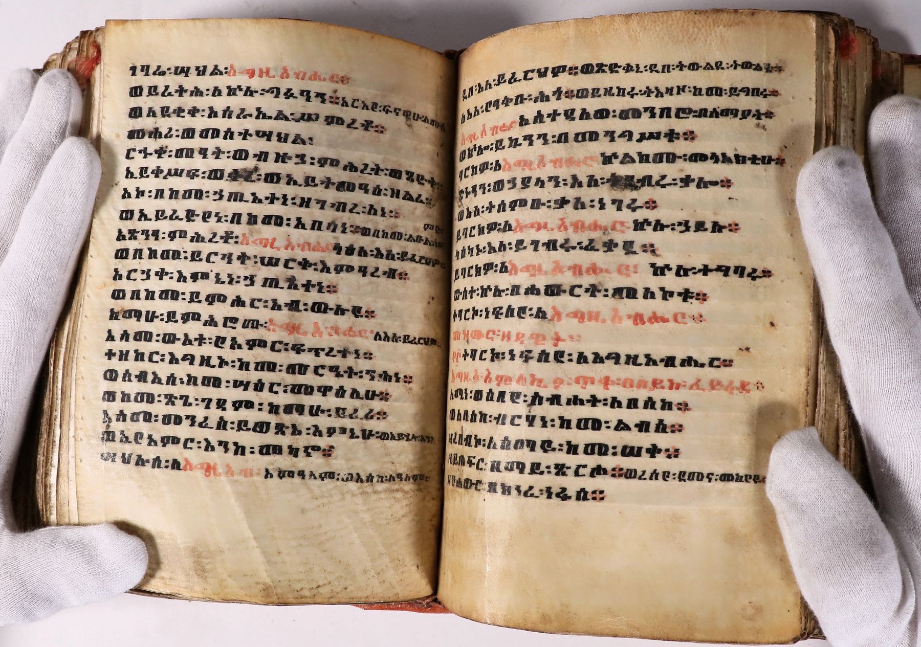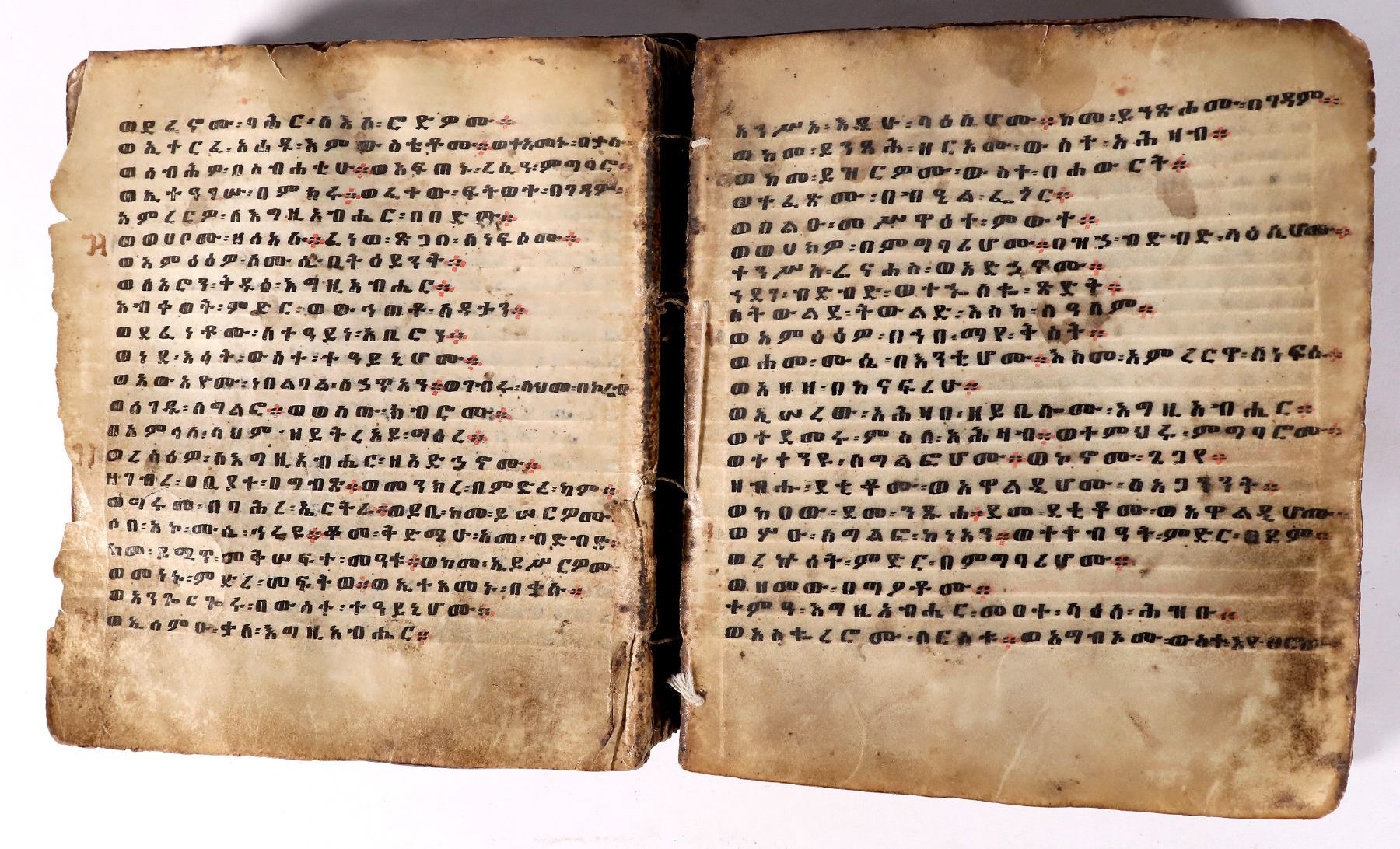 2 old Coptic bibles, likely written in Ethiopic. Obtained from a family of British descent who were missionaries in Ethiopia decades ago. Hand stitched and stamped red leather cover on bible on heavy pages, probably velum. Red and black letters. Some pages have upper red stitch. No illustrations. Housed in a 2 compartment skin case with straps. Not a lot of wear. 7x5.25x2.5" plus case. The other bible is likely much older. Dark brown covers with stamping over brown wood-1 holding by 2 threads, no spine, shows hand stitches where spine would be. Probably velum pages. Red and black letters. Pages have chocolate brown patina on edges. Light liquid stain on a few back pages. No illustrations. 7x6x3.25". Could be c. 1400's, we are unsure of the age of both bibles, both appear to be hand written.
