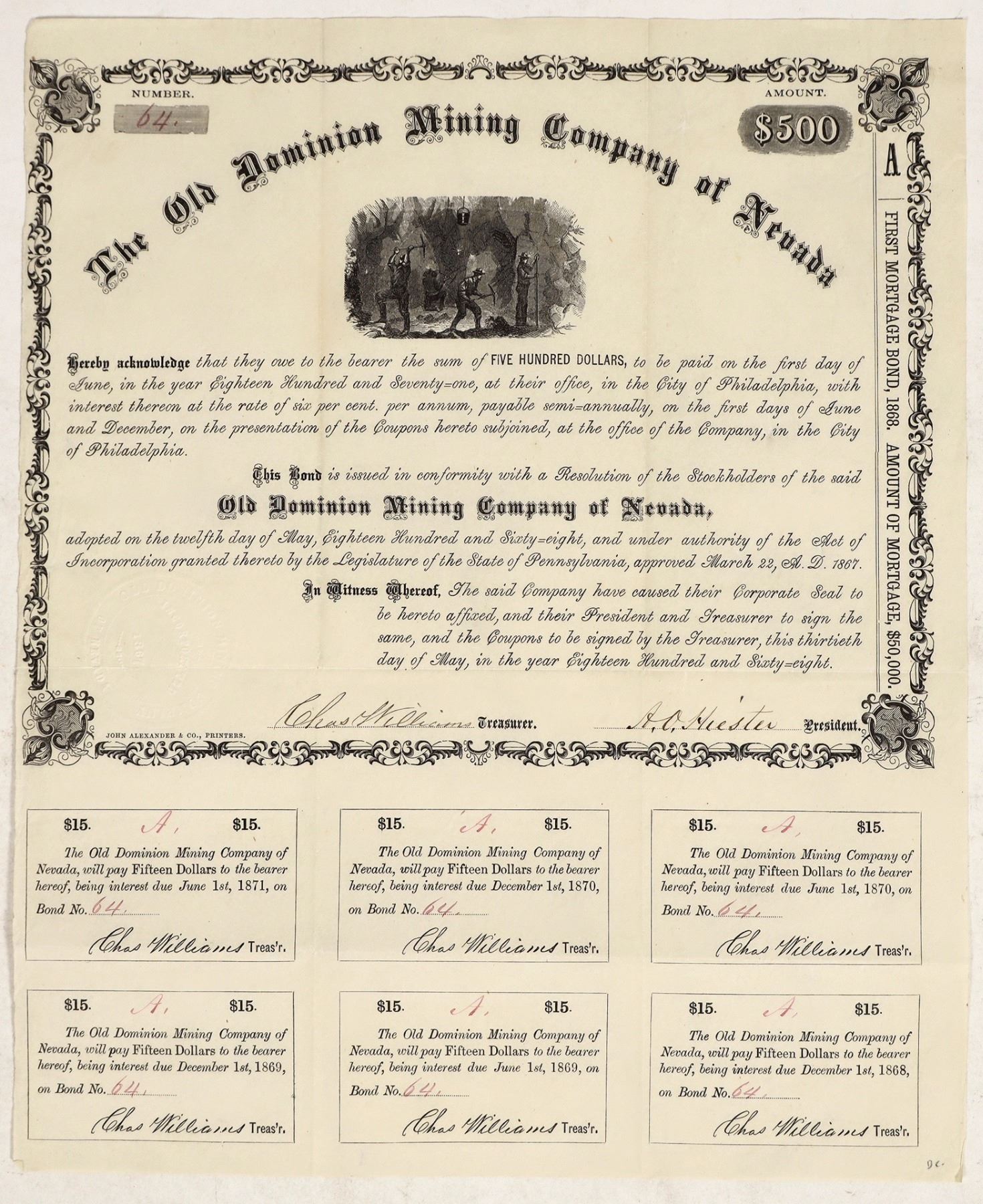 Very rare. No. 64, issued for $500 in 1868. Signed by company president AO Hiester and treasurer Charles Williams. Not cancelled. Six coupons attached. Black border and print, underground mining vignette. The Old Dominion Mining Company was located outside of Keystone, Nye County, Nevada in Tybo (Hot Creek) Mining District. The town of Keystone was established as a company town for the mining company and never truly established itself as anything more than a mining camp. The population stayed low, never reaching any higher than 50, but that was enough to support two saloons. After the initial mining rush of 1867, the camp was mostly silent until the discovery of a rich silver deposit made in 1910. 13 x 11"