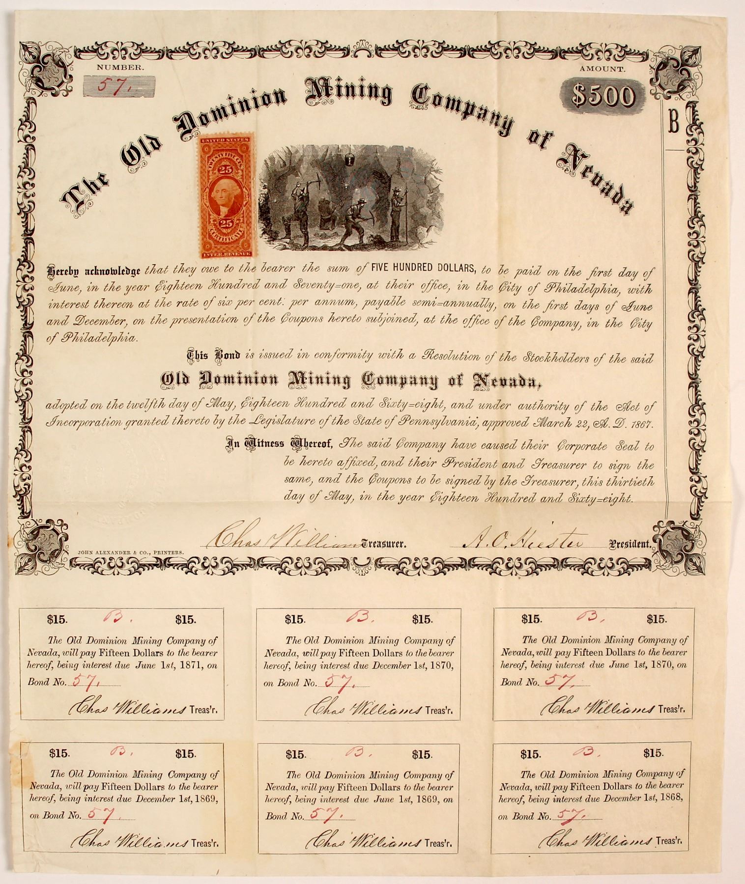 The Old Dominion Mining Company was located outside of Keystone, Nye County, Nevada in Tybo (Hot Creek) Mining District. The town of Keystone was established as a company town for the mining company and never truly established itself as anything more than a mining camp. The population stayed low, never reaching any higher than 50, but that was enough to support two saloons. After the initial mining rush of 1867, the camp was mostly silent until the discovery of a rich silver deposit made in 1910. The Old Dominion Mining Company was incorporated in 1867 under the laws of Pennsylvania. The company offices were located in Philadelphia, Pennsylvania. This is a rare certificate because it has been financed by an eastern company in a time when it was nearly impossible for eastern financier companies to enter into business in the western mining interests. (Information on Keystone from http://www.ghosttowns.com/states/nv/keystone.htm). The bond has a decorative border and the terms of the bond, is Number 60 and is for the amount of $500. There is a vignette of 4 miners in the top center of the certificate. A company seal and the signatures of the treasurer, Chas. Williams, and the president, A. O. Hiester, are present on the bottom. The second part of this document includes six coupons at $15 each. One has the date of 1868, two 1869, two 1870, and one 1871. Very nice condition. Prag Collection City: Keystone State: Nevada Date: 1867 HWAC# 79242
