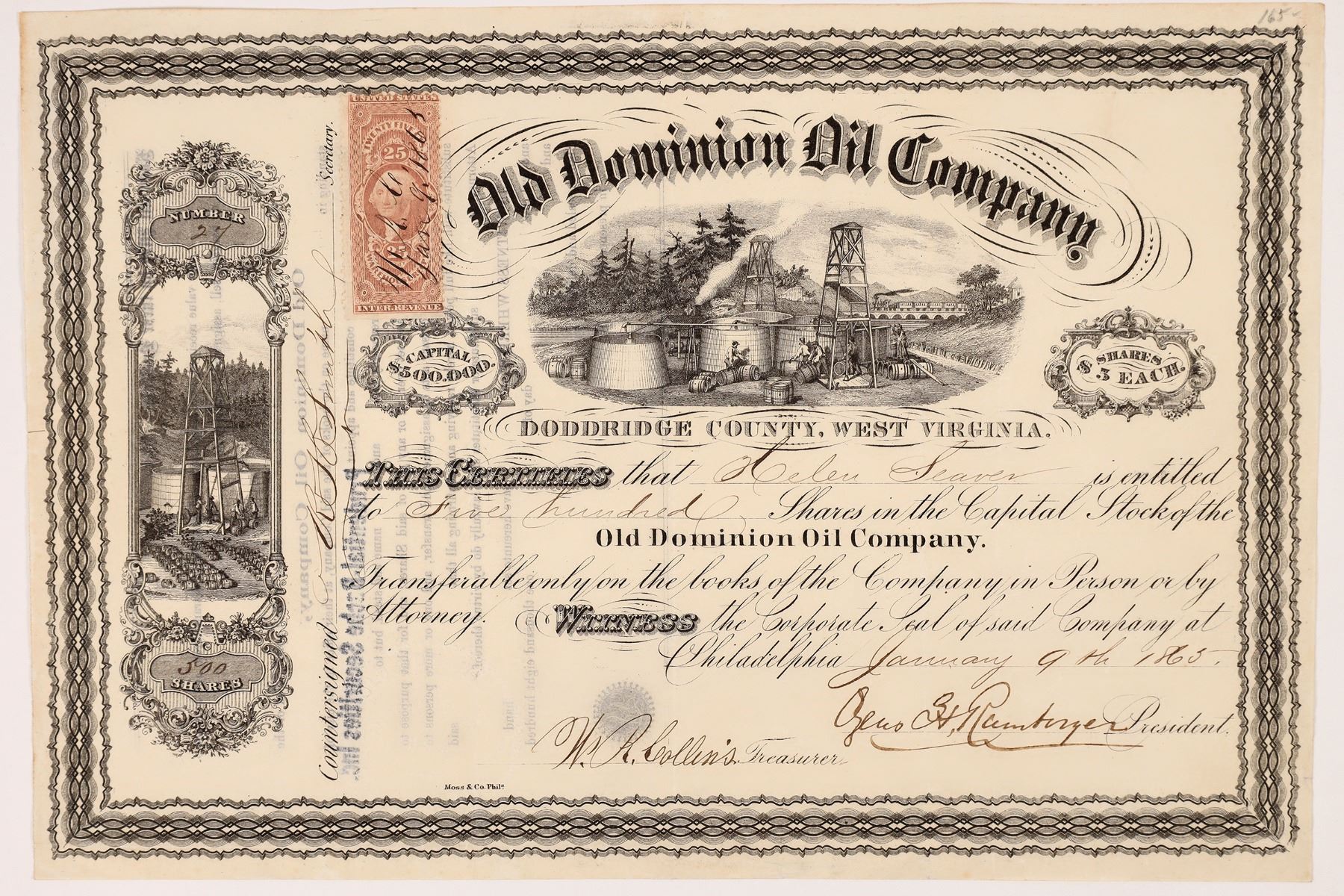 "Doddridge County, West Virginia" printed under vignette. No. 27, issued for 500 shares to Helen Seaver in 1865 in Philadelphia. Signed by the president (illegible) and treasurer W.R. Collins. Not cancelled. Two oil vignettes. Printed by Moss & Co., Philadelphia. 25 cent US IR Warehouse Receipt stamp. Folds, clean. 7.5 x 11"