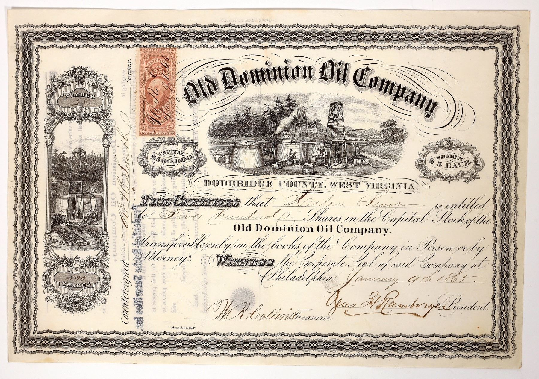 Issued 1865 Old Dominion Oil with 2 nice derrick vignettes. Good looking stock. 25c adhesive warehouse stamp.