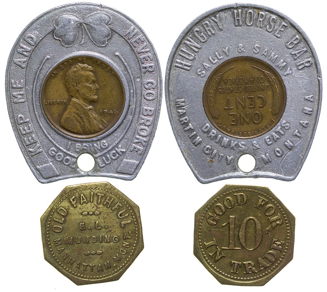 1) R-7 Old Faithful / E. L. / Munding / Manhattan, Mont. // GF / 10c / IT. Octagonal, brass, 22mm. 2) Martin City token: Hungry Horse Bar / Sally & Sammy / Drinks & Eats / Martin City Montana // Keep Me and Never Go Broke / I Bring / Good Luck. Aluminum horseshoe shape with penny in center. City: Manhattan State: Montana, Date: Inventory# 39611