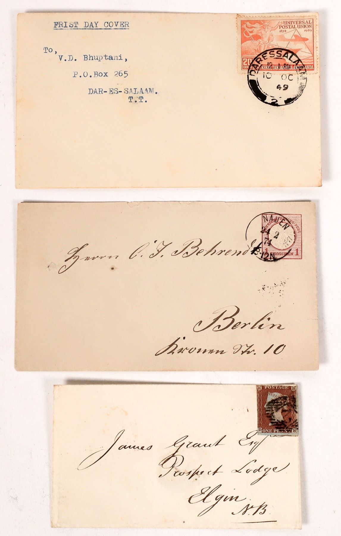 3 old foreign covers. First Day Cover Africa 1949. 1846 British red one penny. German embossed 1 Groschen.