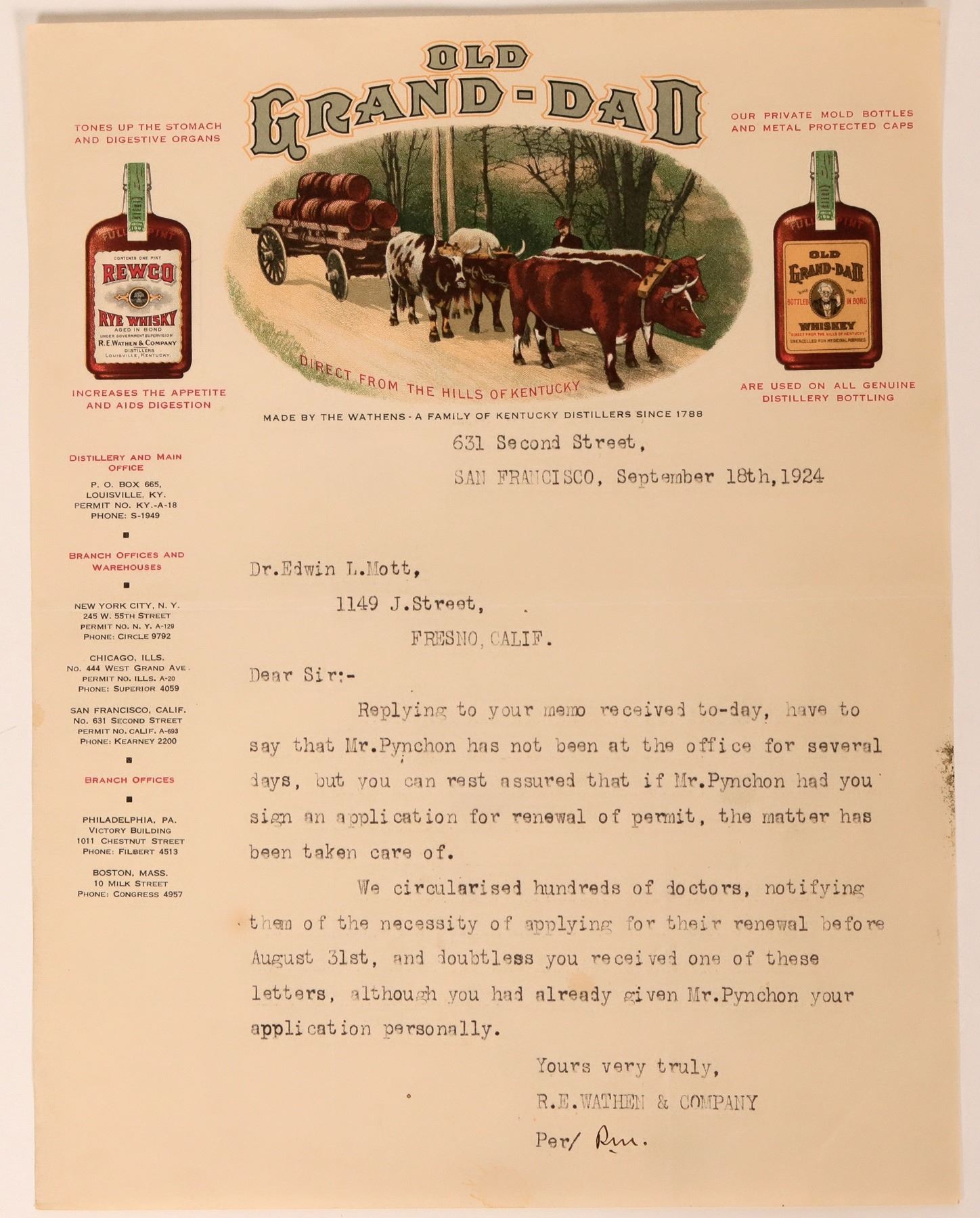 Very attractive color letterhead for Old Grand-Dad whiskey, distilled in Louisville, Kentucky with a branch office in San Francisco. This letter is sent from the SF office in 1924 to Edwin Mott in Fresno. Refers to renewal of permit for Mr. Pynchon. Color vignettes of two different whiskey bottles plus vignette of pack animals pulling logs. Folds, light wear.