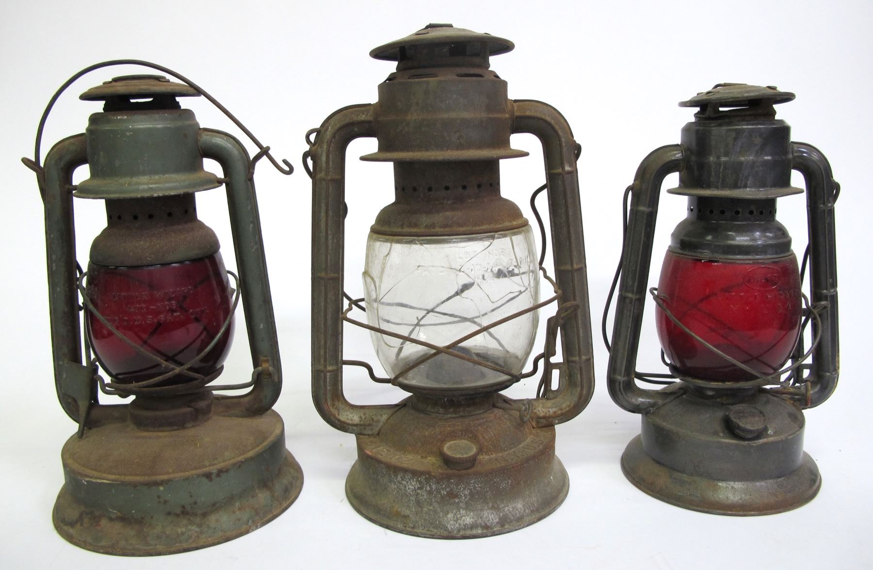 3 rusty old lanterns-2 Deitz, 1 Little Wizard. 2 red globes, 1 clear globe with multiple cracks. State: City: Date: