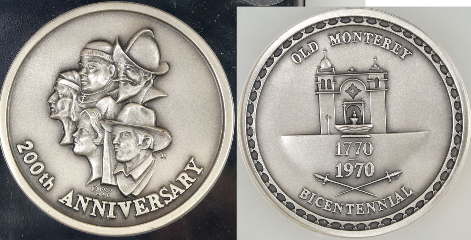 Number 202 of mintage of 1000, this silver medal commemorates the 200th Anniversary of Old Monterey, 1770-1970. In original vinyl case and hard plastic holder. Made by Medallic Art Company, 38 mm. Symbolizing 200 years of California history, this limited edition medallion features a deep relief of Father Sierra, Gaspar de Portola, an Indian, a senorita and an early settler. The reverse shows the facade of Carmel Mission. We believe this medal weighs 141 grams of .999 pure silver. City:Monterey State:California Date: Salvatore Falcone Collection