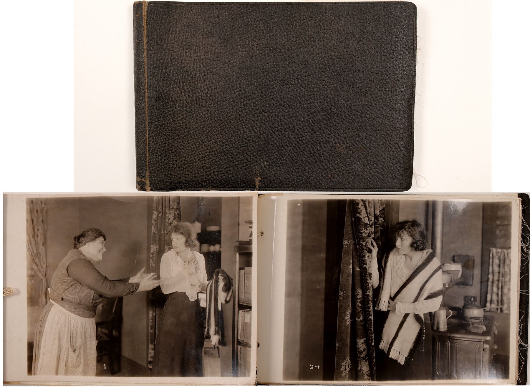 An album of 40 black and white 8 x 10 photos of dramatic poses from an early motion picture. No identification, possibly a silent film. Worthy of investigation to determine the actors and actresses and the film's title. We were stumped.