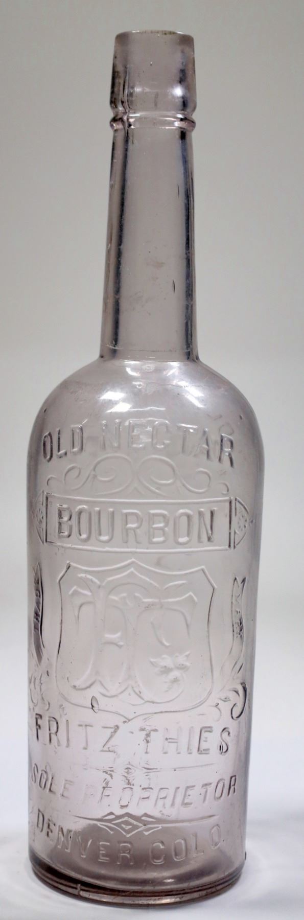 Preble W-72a. Old Nectar / Bourbon / Fritz Thies / Sole Proprietor / Denver, Colo. Reverse: Old Nectar / Whiskey. 11 5/8", wiped top. Chip on lip, scratches, other surface wear. Please inspect.