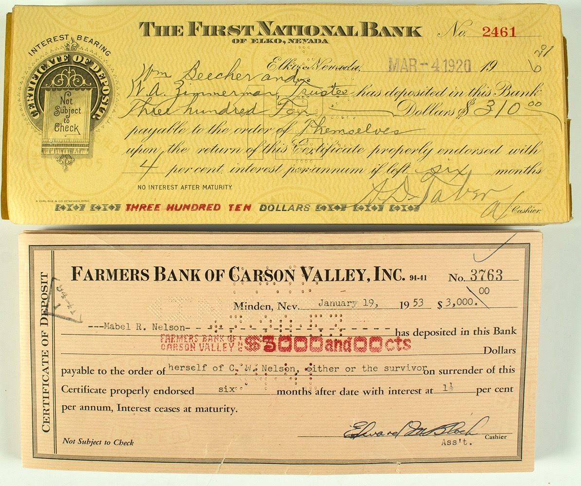 Two batches of checks: from the Farmers Bank of Carson Valley, Inc. circa 1950s; and the First National Bank of Elko circa 1920s. 170 pieces in all. Date: Location: Nevada HWAC# 48245