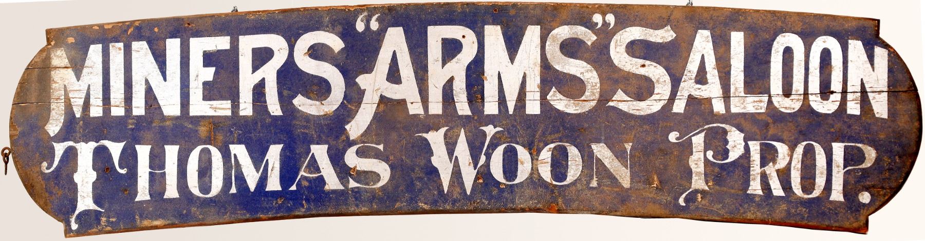 An 1890s era saloon sign from Nevada City, Nevada County, California. Sign reads, "Miner's Arms Saloon" Thomas Woon Prop. Woon married an English Lady and after a fire heavily damaged the saloon, he worked at The Holiday Quartz Mine near Bloomfield.