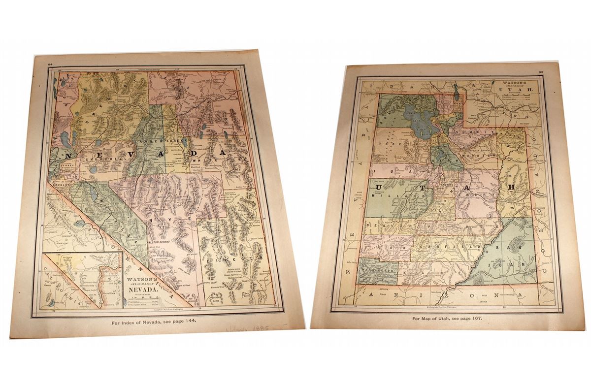 From Watson’s Atlas. You will find Roop County still listed. There is no White Pine County. There is no Mineral County. There isn’t even a Clark County! Great interest for the historian!